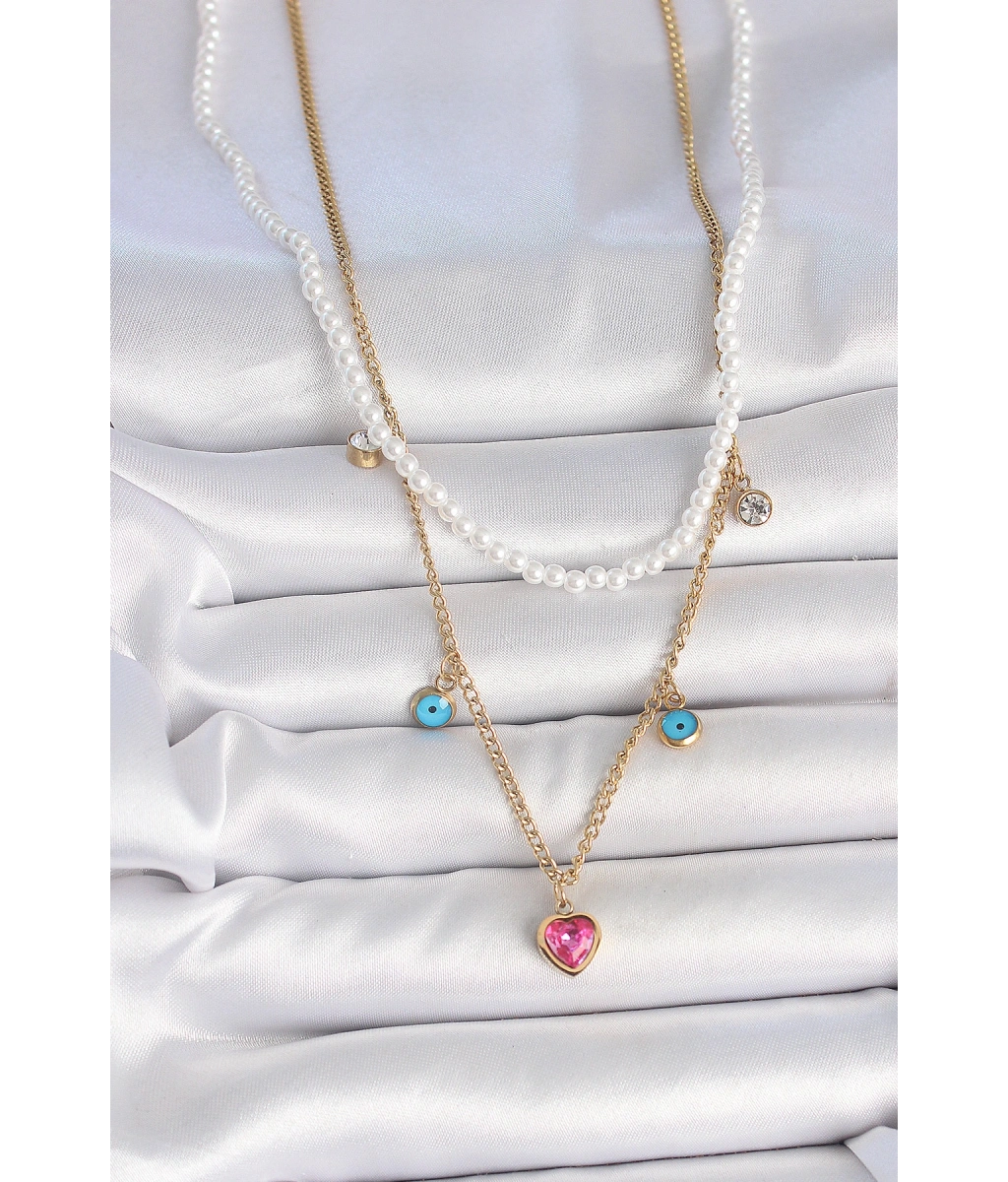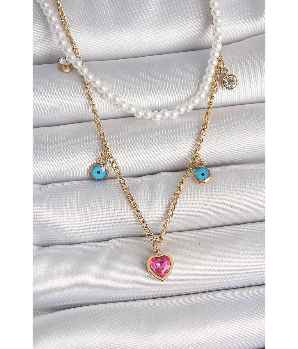 Shoecide 316l Çelik Gold Renk 2'li İnci Zincir Model Pembe Taşlı Kalp Figür Nazar Boncuk Detay Kadın Kolye