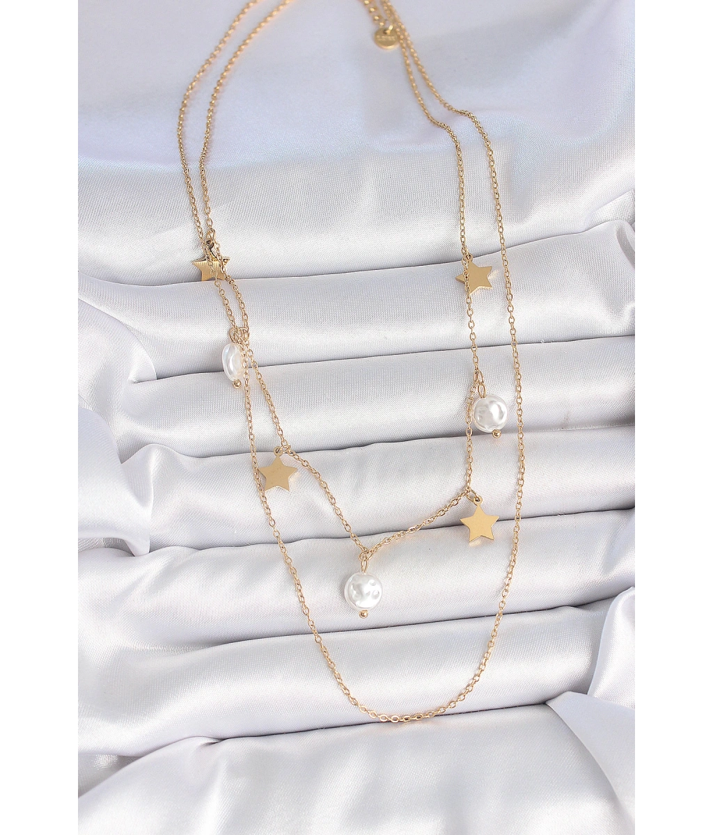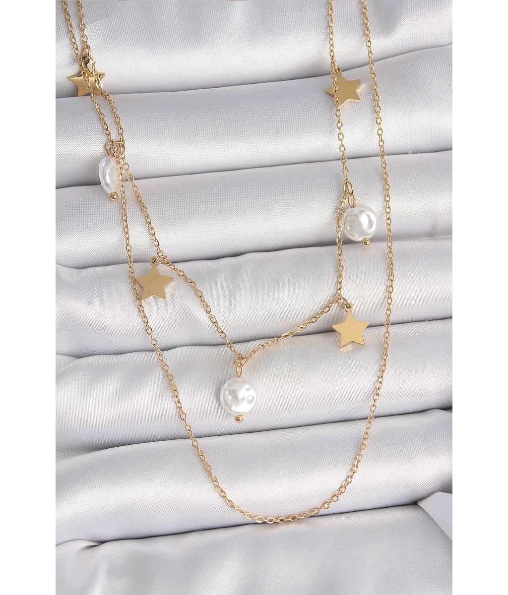 Shoecide 316l Çelik Gold Renk 2'li Zincir Sallantı Yıldız İnci Model Kadın Kolye