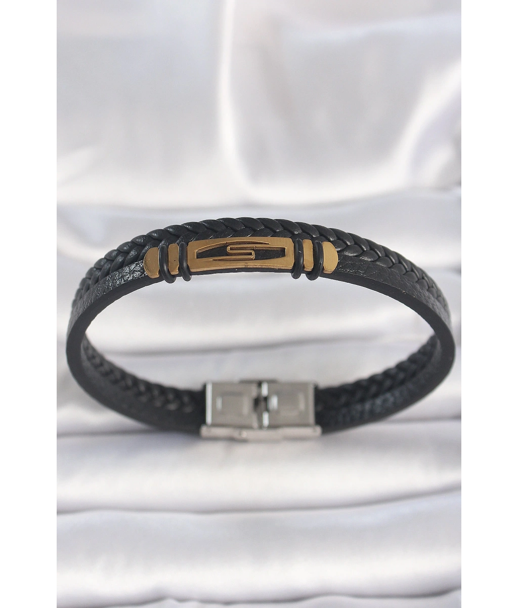 Shoecide 316l Çelik Gold Renk Aksesuarlı Çift Sıra Siyah Burgu Desenli Deri Kordon Erkek Bileklik