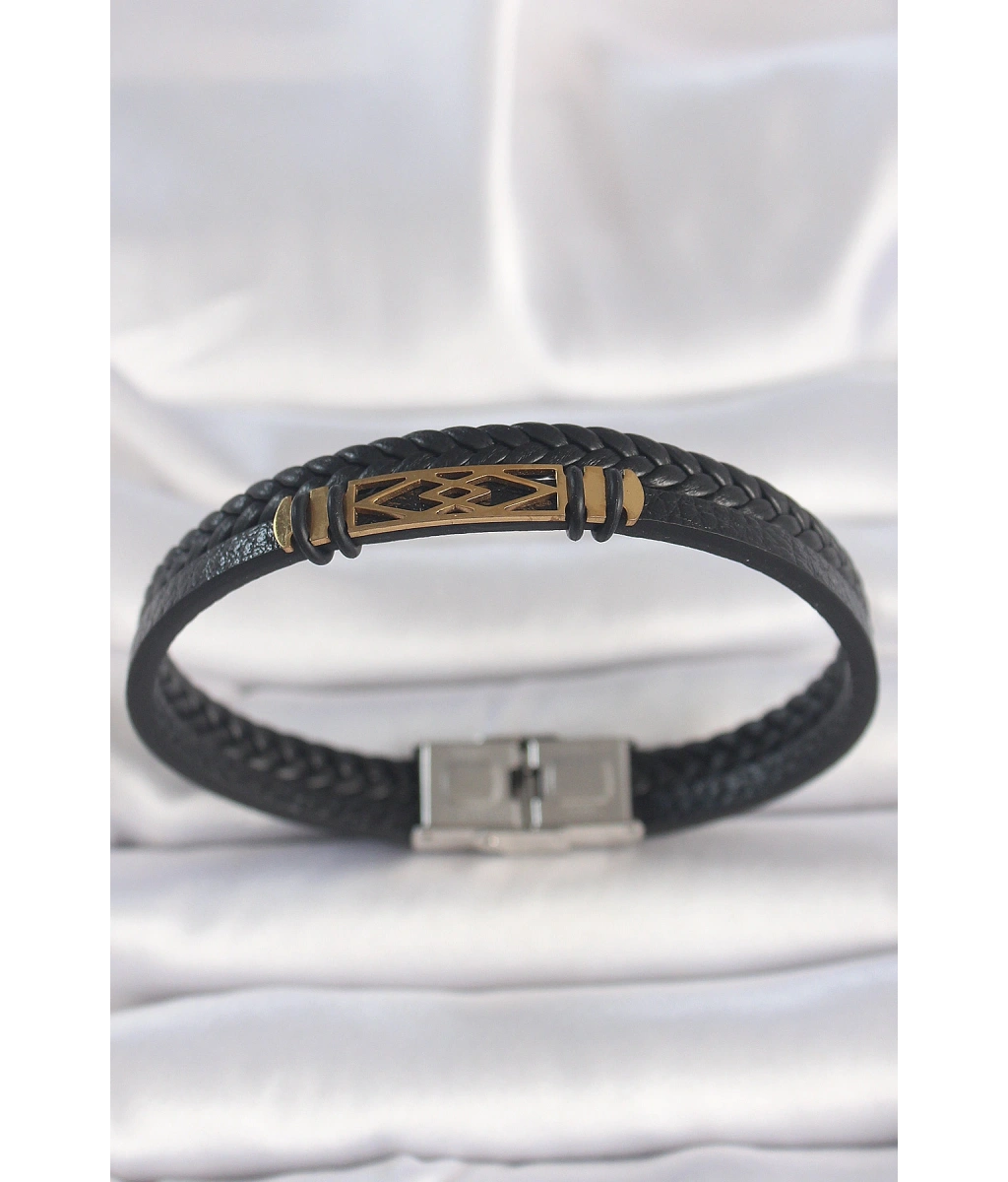 Shoecide 316l Çelik Gold Renk Aksesuarlı Çift Sıra Siyah Burgu Desenli Deri Kordon Erkek Bileklik