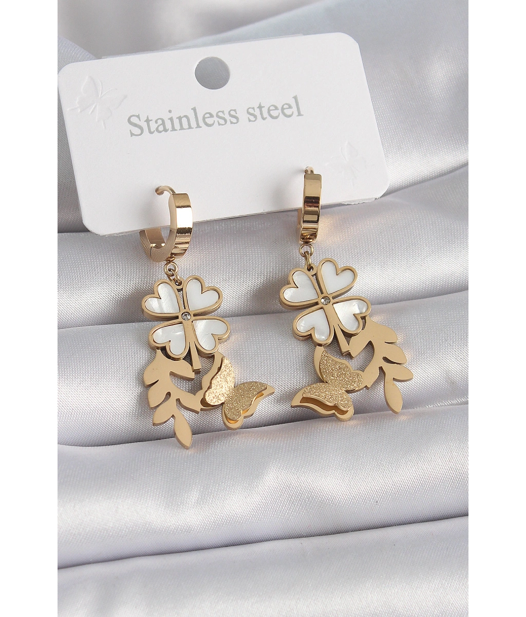 Shoecide 316l Çelik Gold Renk Beyaz Sedefli Yonca Simli Kelebek Figür Kadın Küpe