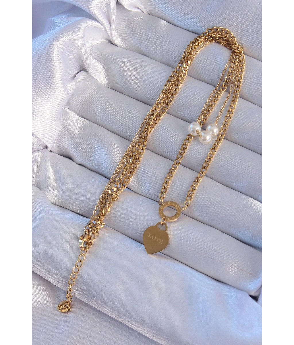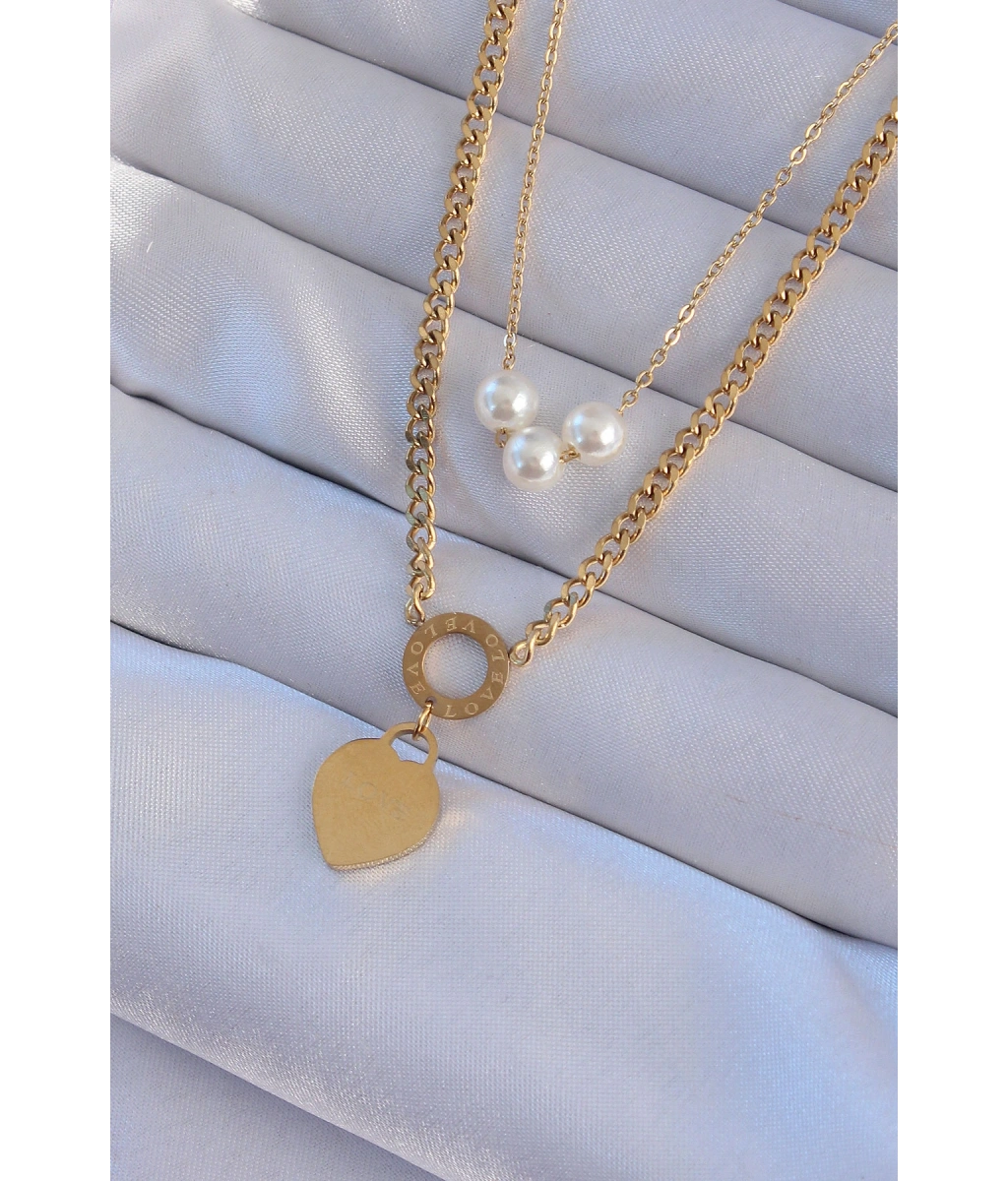 Shoecide 316l Çelik Gold Renk Çift Zincir İnci Detayı Love Kalp Kolye
