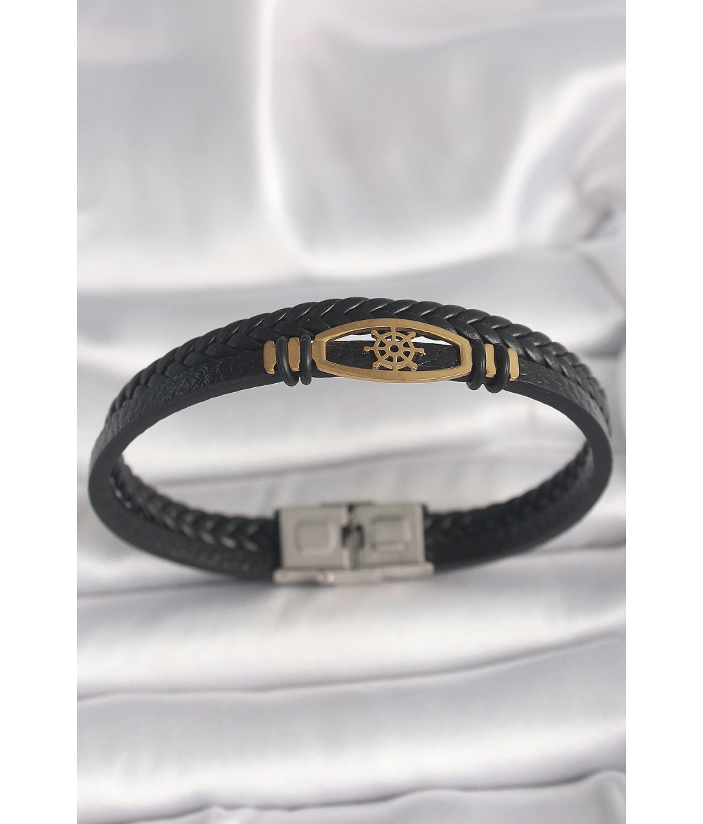 Shoecide 316l Çelik Gold Renk Gemi Dümen Figür Siyah Renk Çift Sıra Burgu Desenli Deri Kordon Erkek Bileklik