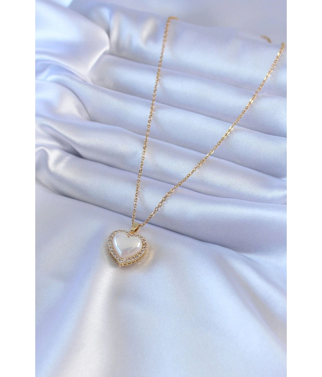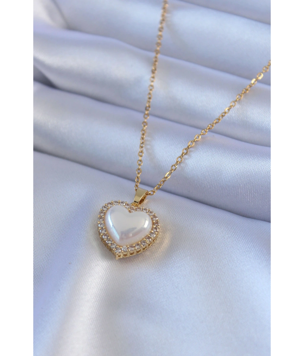Shoecide 316l Çelik Gold Renk İncili Kalp Model Zirkon Taşlı Kadın Kolye