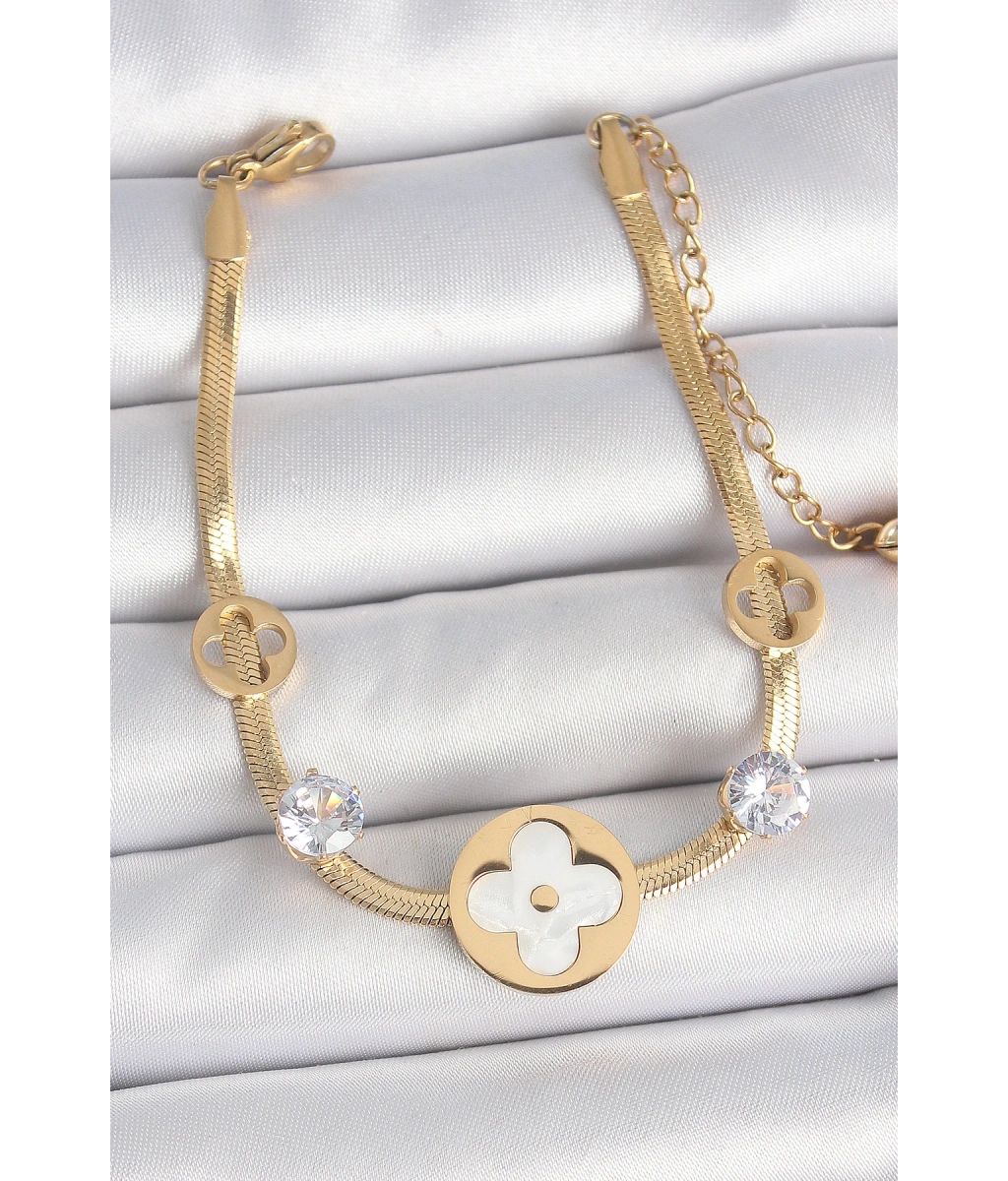 Shoecide 316l Çelik Gold Renk İtalyan Zincir Beyaz Mineli Yonca Model Zirkon Taş Detaylı Kadın Bileklik