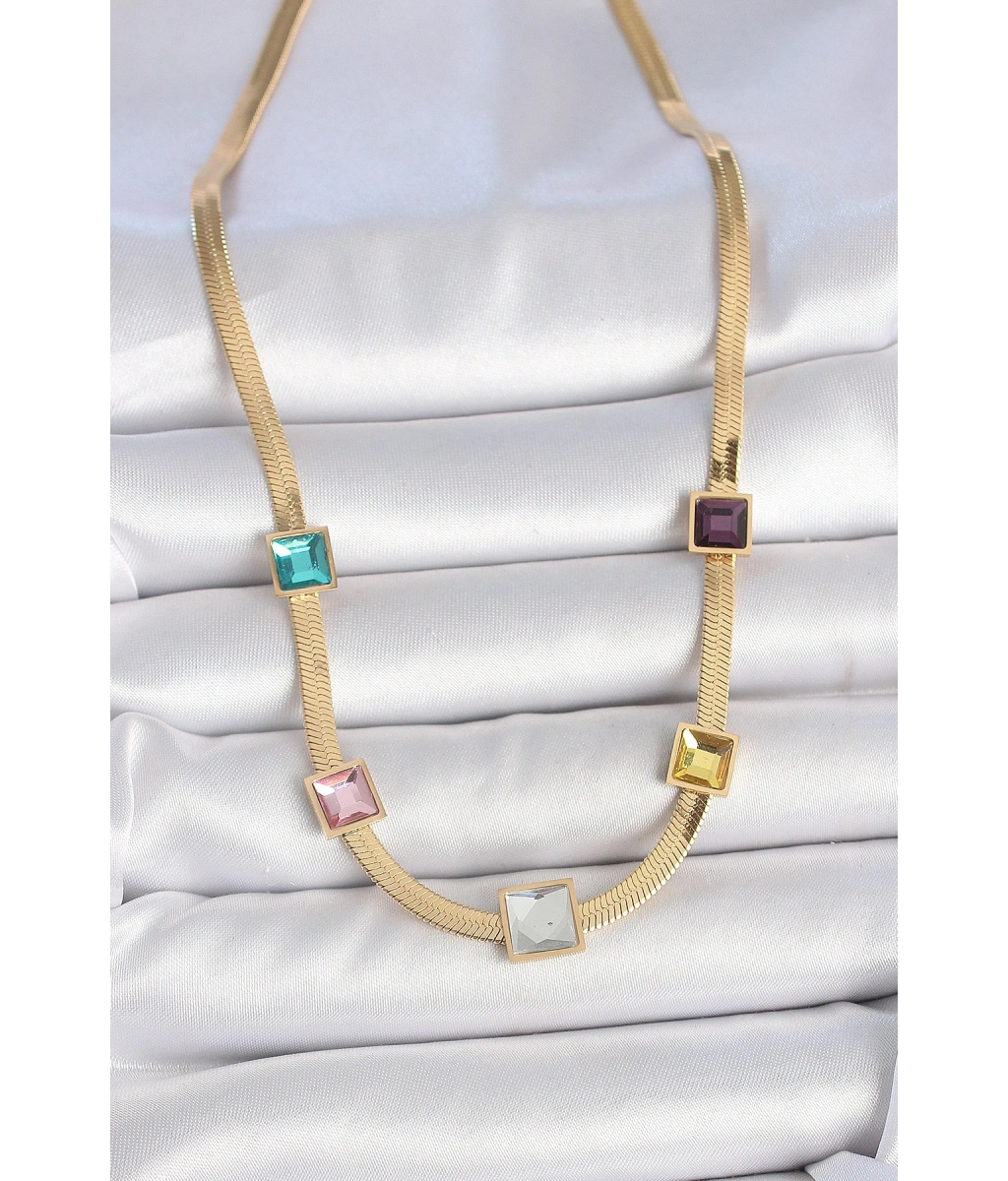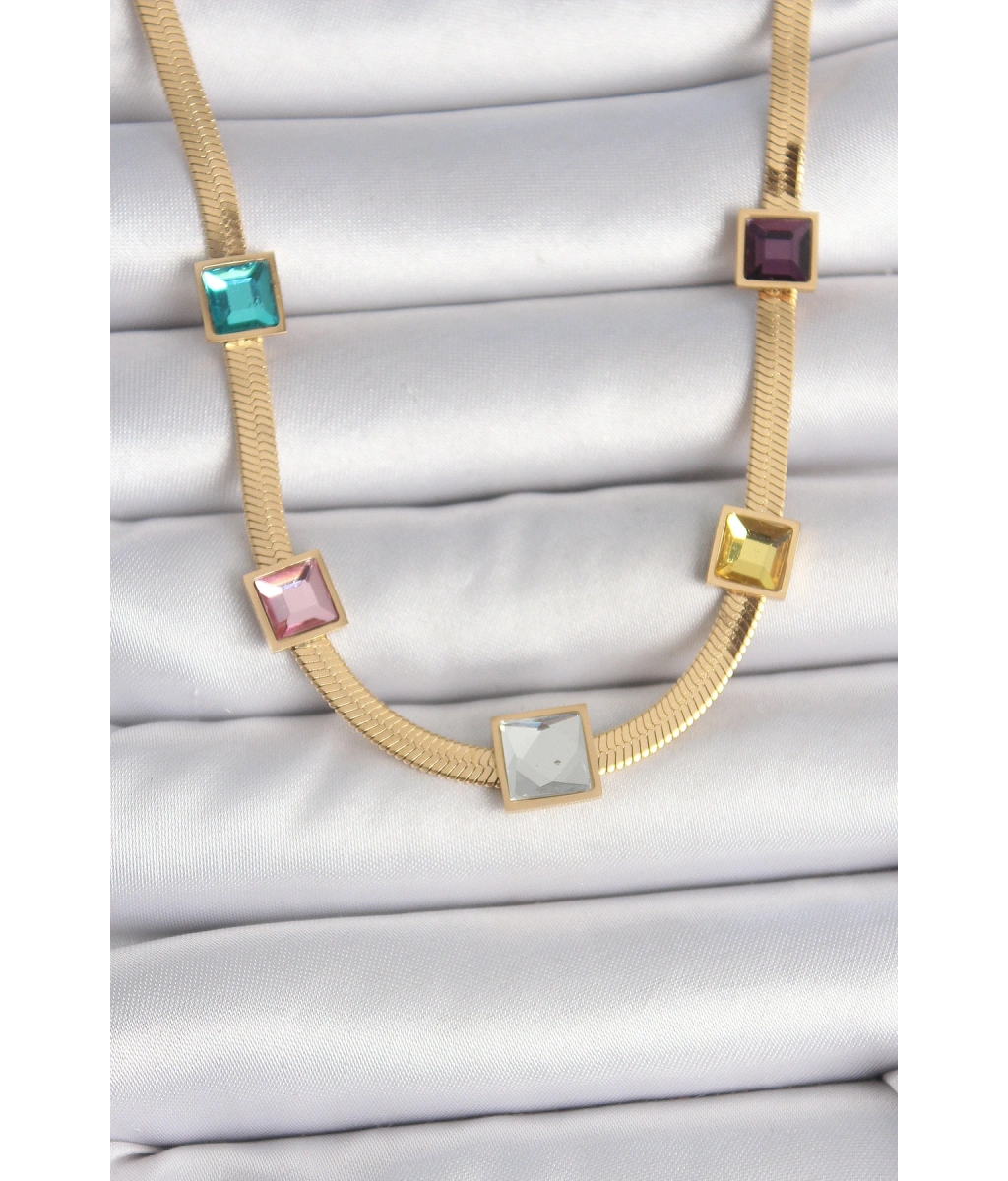 Shoecide 316l Çelik Gold Renk İtalyan Zincir Model Kare Renkli Zirkon Taşlı Kadın Kolye