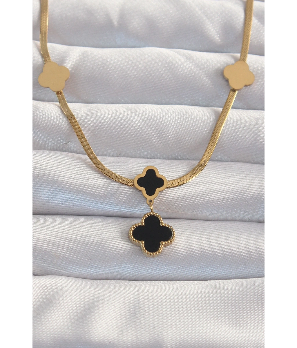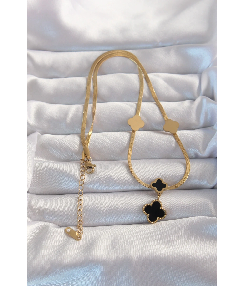 Shoecide 316l Çelik Zincir Gold Renk Siyah Ve Zirkon Taşlı Baby Boy Yonca Kadın Kolye