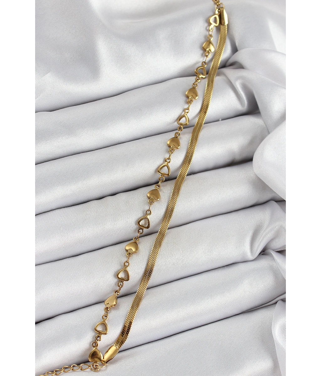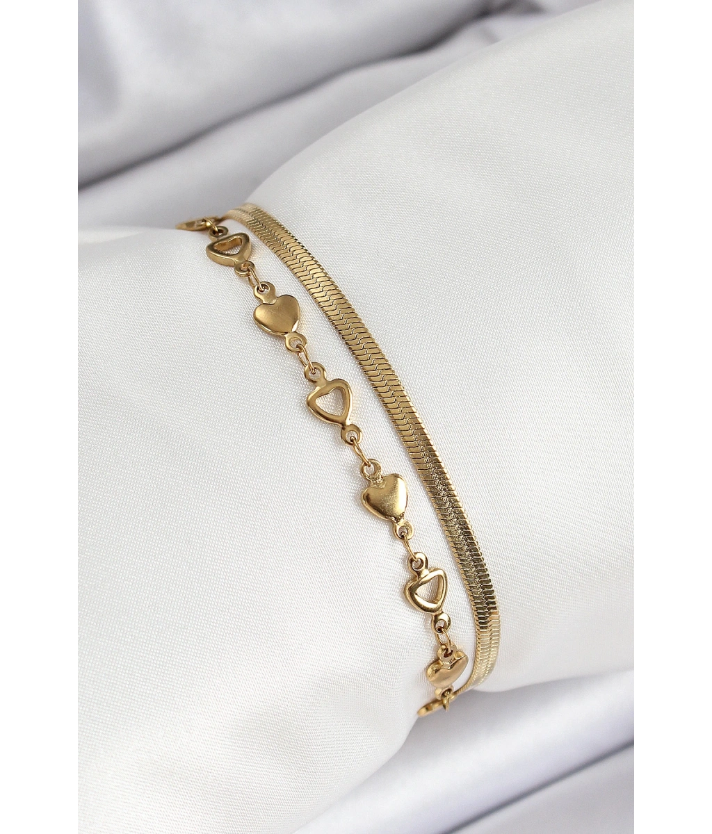 Shoecide 316l Çelik Gold Renk Kalpli Zincir Ve İtalyan Zincirli 2'li Kadın Bileklik