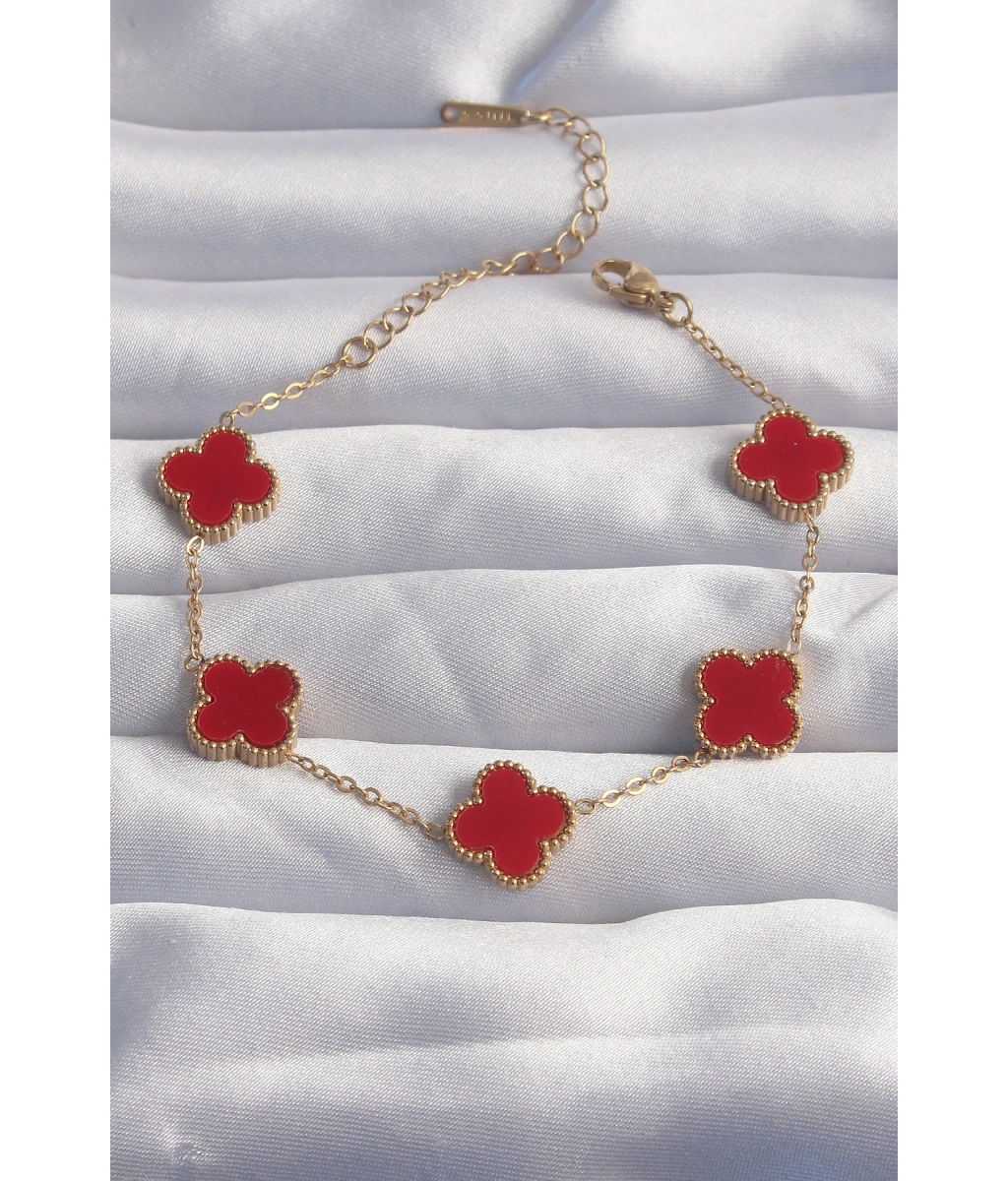Shoecide 316l Çelik Gold Renk Kırmızı Mineli Yonca Bileklik