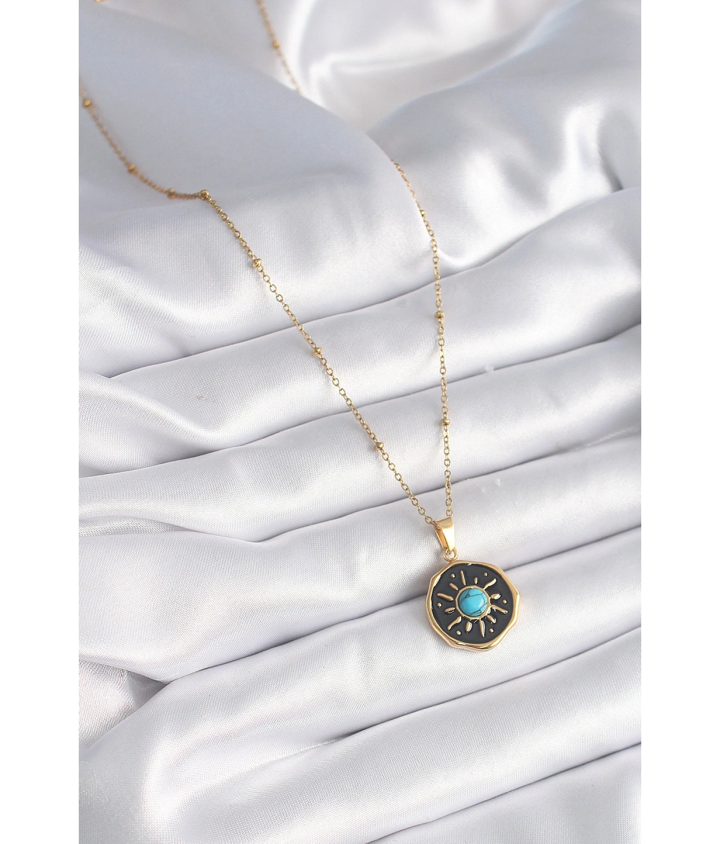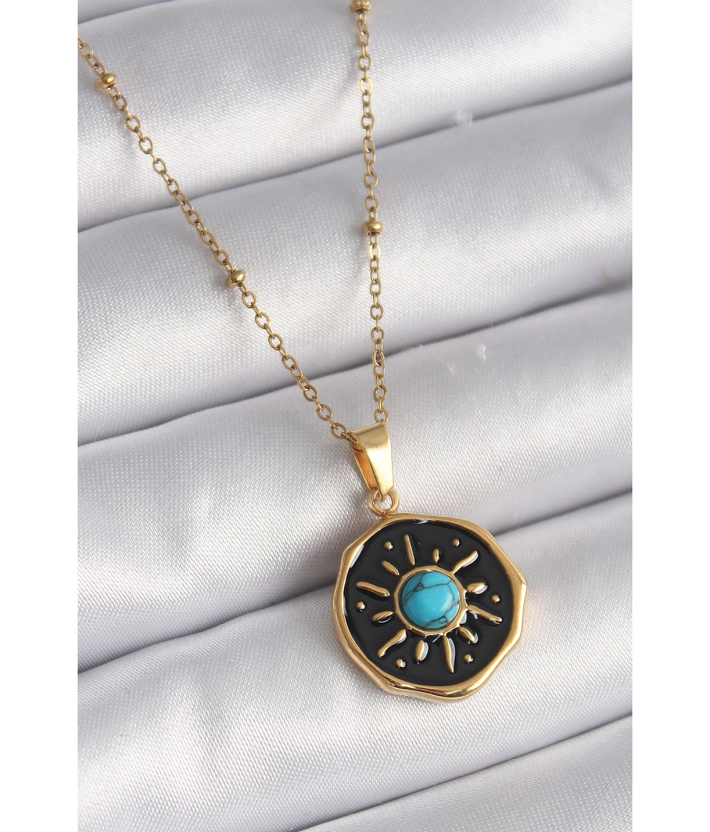 Shoecide 316l Çelik Gold Renk Mavi Boncuk Güneş İşleme Madalyon Model Kadın Kolye