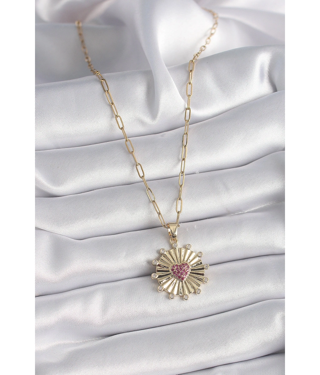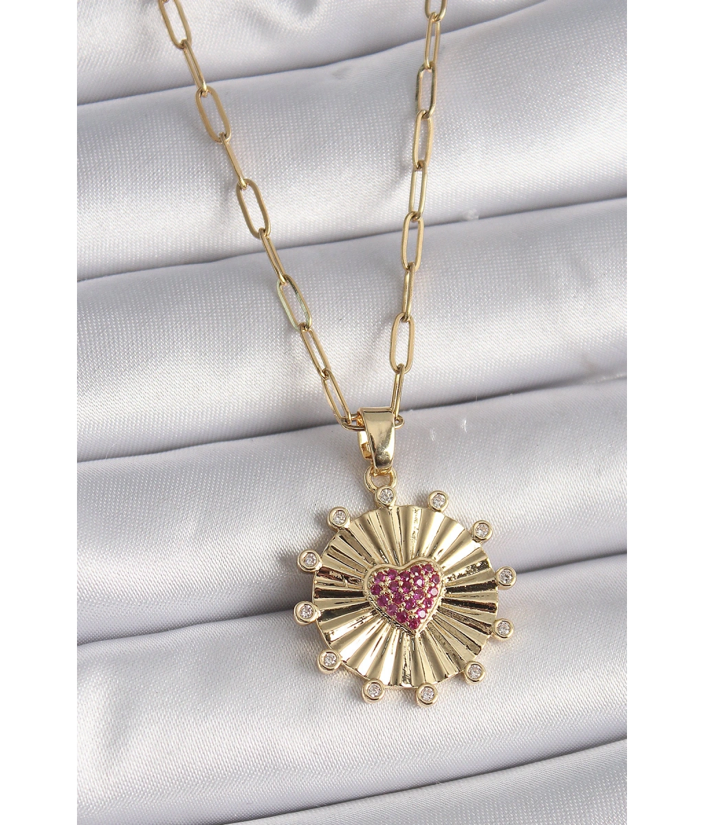 Shoecide 316l Çelik Gold Renk Pembe Zirkon Taşlı Kalp İşleme Madalyon Model Kadın Kolye