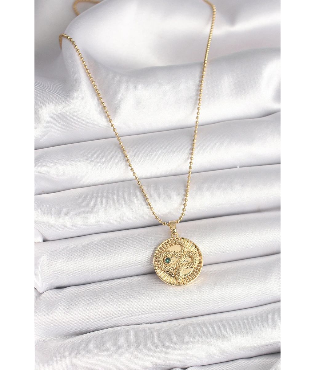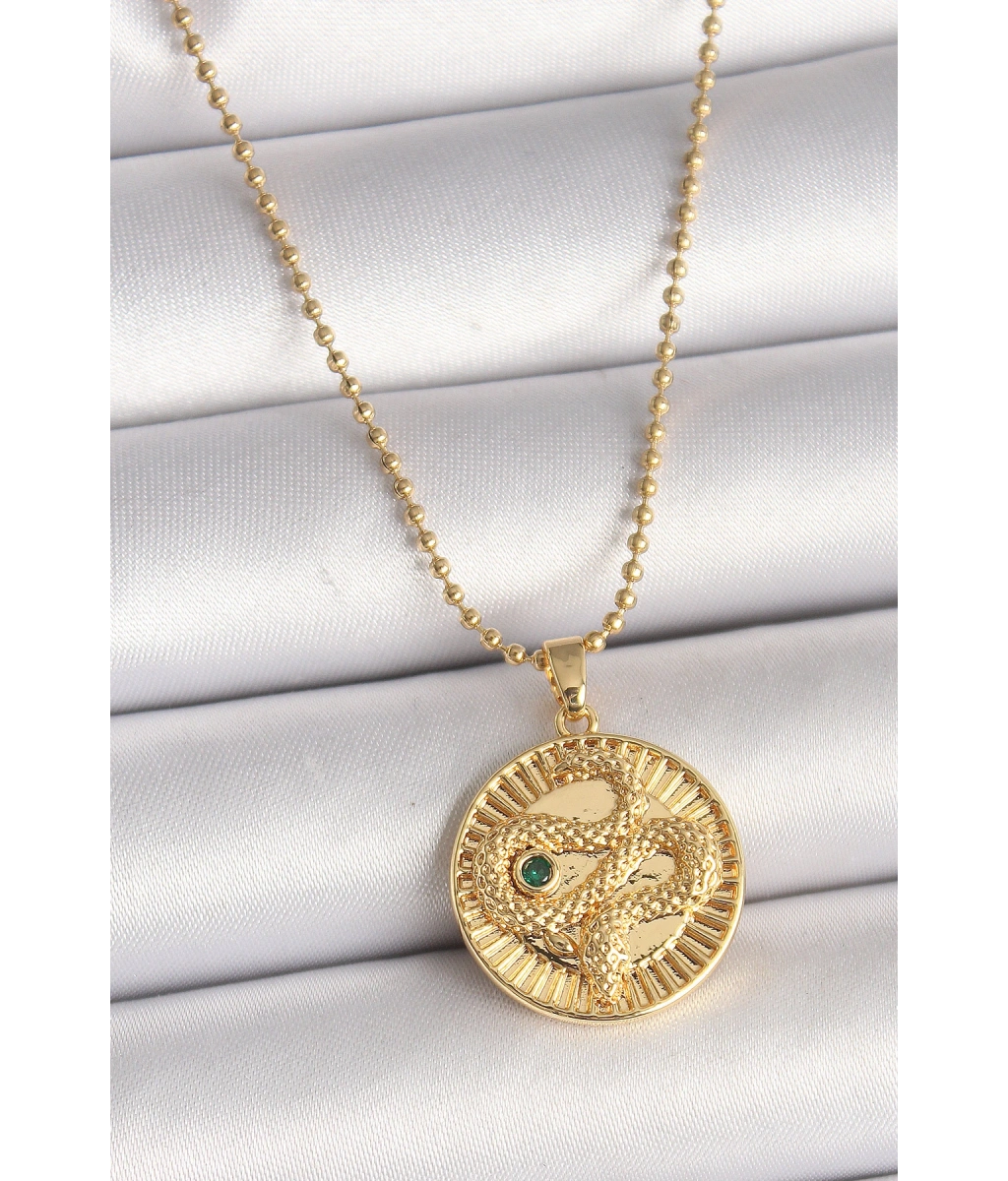 Shoecide 316l Çelik Gold Renk Topçuk Zincir Yılan İşlemeli Zirkon Taş Detaylı Madalyon Model Kadın Kolye