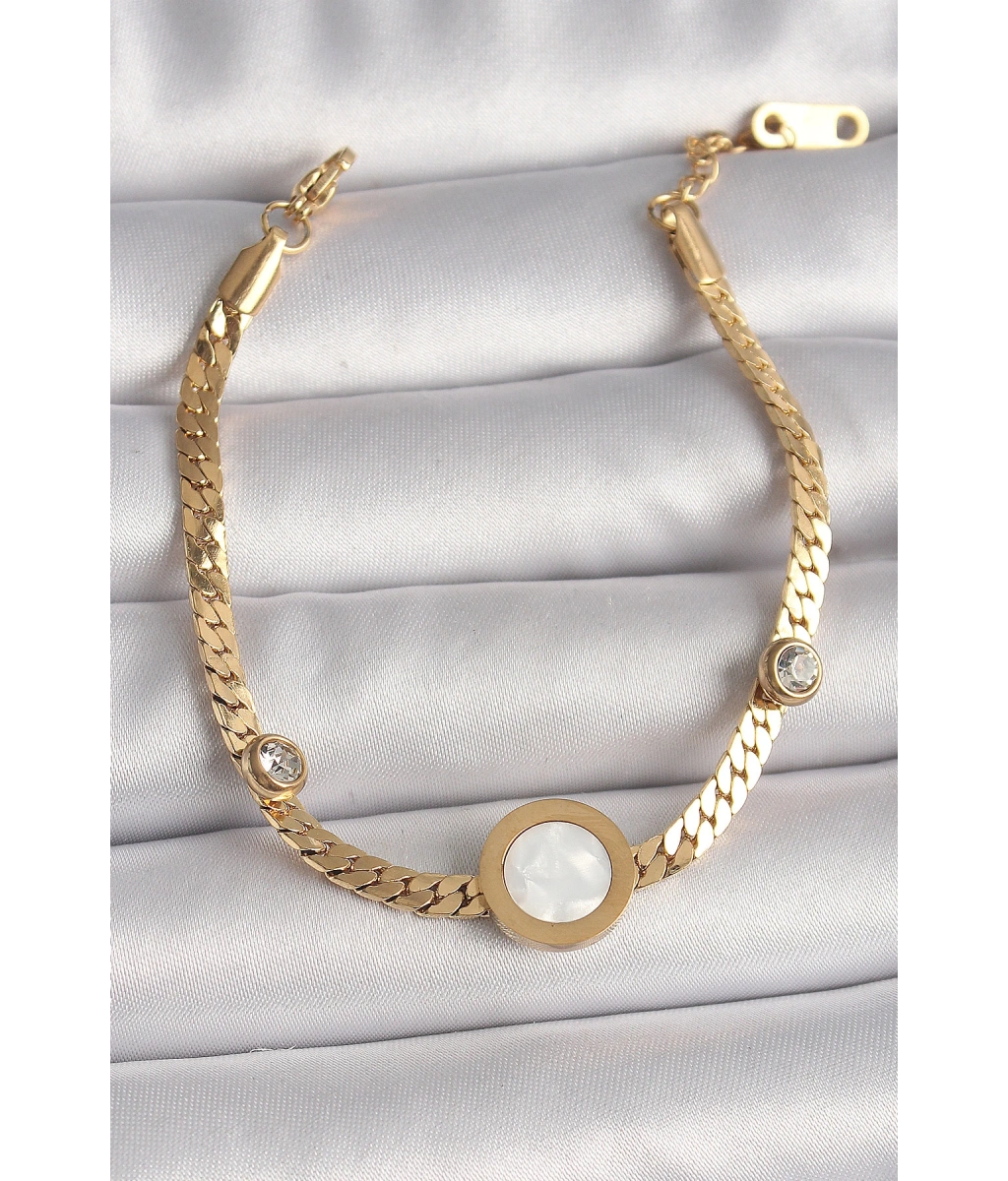 Shoecide 316l Çelik Gold Renk Yassı Zincir Model Zirkon Taş Detaylı Beyaz Mineli Madalyon Model Kadın Bileklik