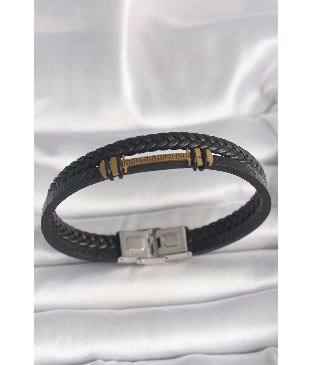 Shoecide 316l Çelik Gold Renk Zikzak İşlemeli Aksesuarlı Çift Sıra Burgu Desenli Deri Kordon Erkek Bileklik
