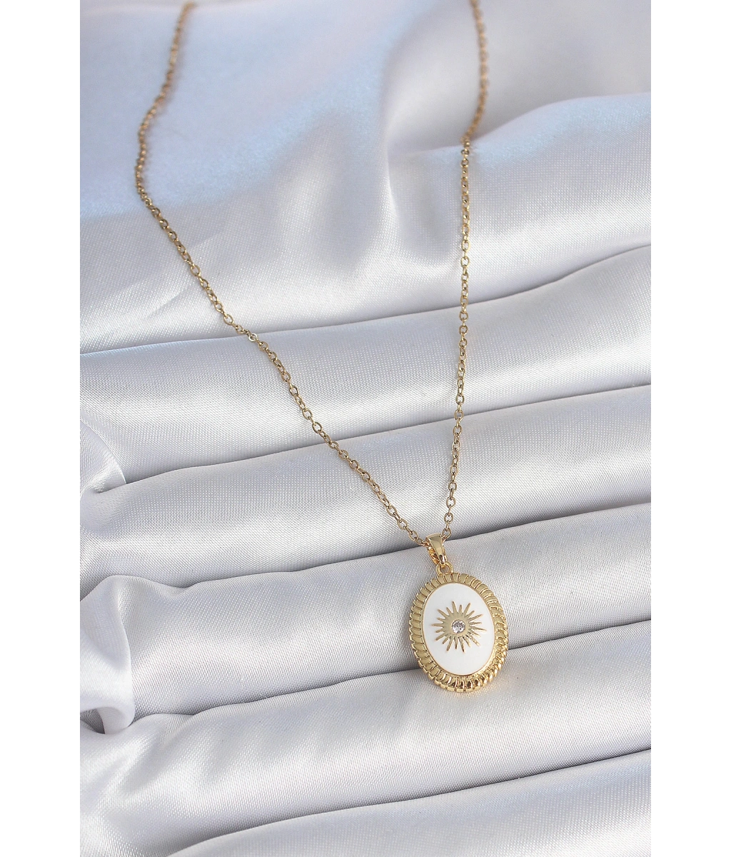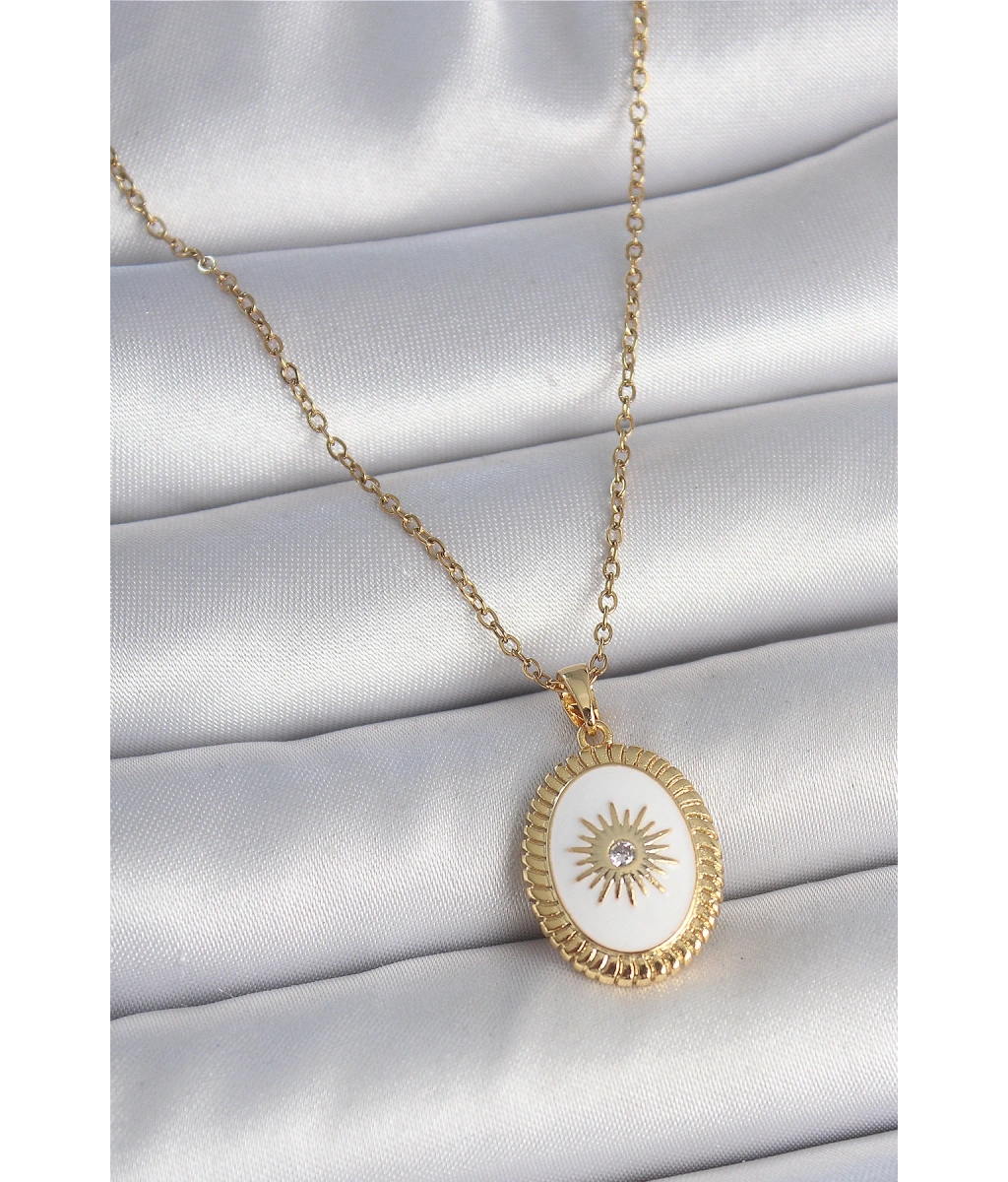Shoecide 316l Çelik Gold Renk Zincir Beyaz Mineli Güneş İşlemeli Zirkon Taş Detaylı Madalyon Model Kadın Kolye
