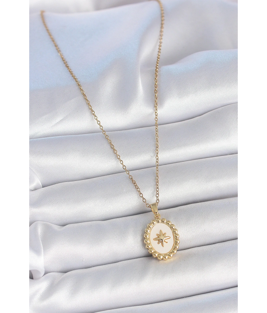Shoecide 316l Çelik Gold Renk Zincir Beyaz Mineli Kutup Yıldız İşlemeli Madalyon Model Kadın Kolye