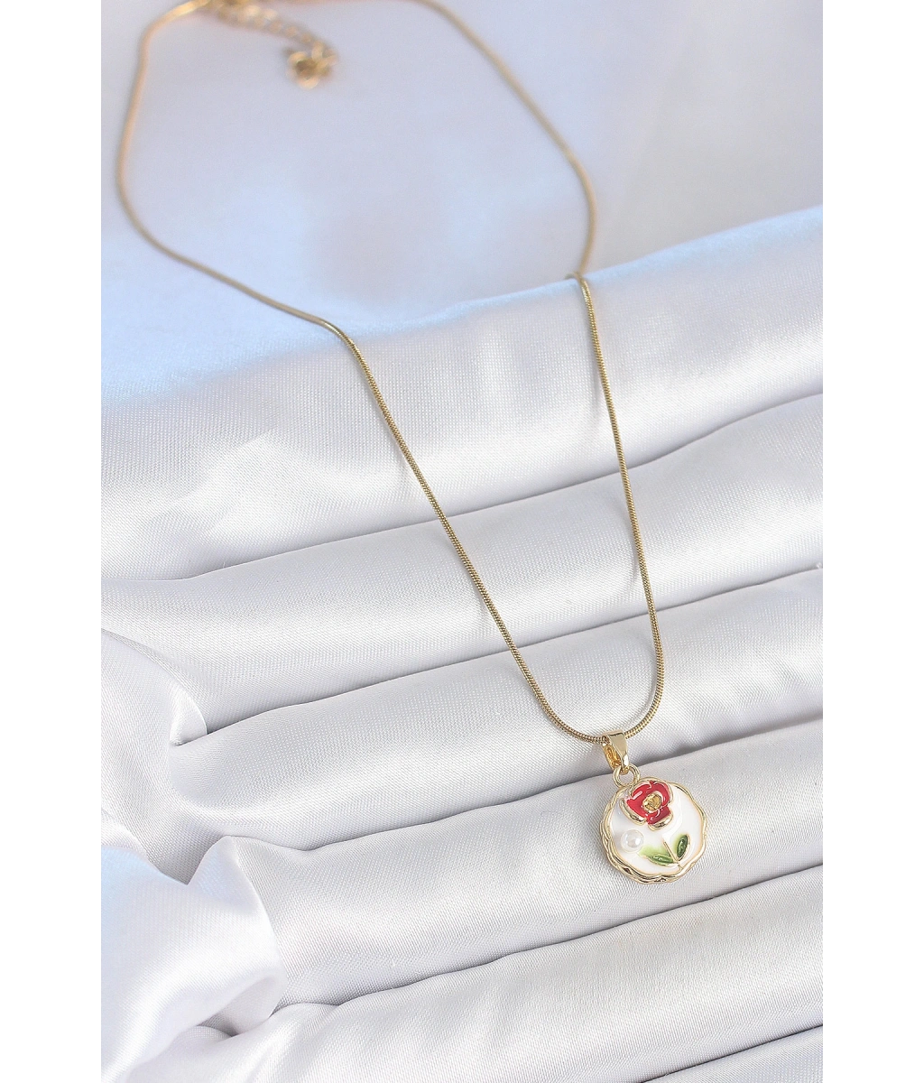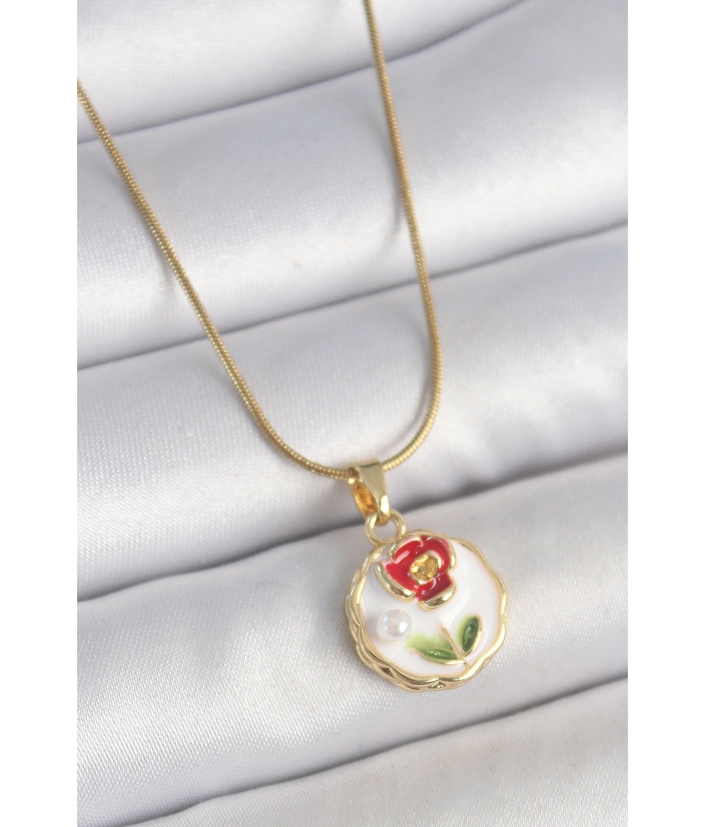 Shoecide 316l Çelik Gold Renk Zincir Beyaz Minimal Çiçek İşlemeli İnci Detay Portre Model Kadın Kolye