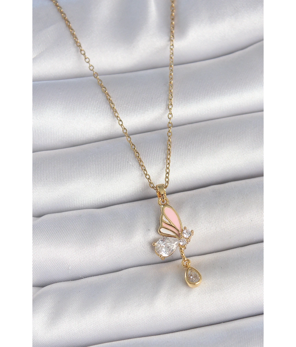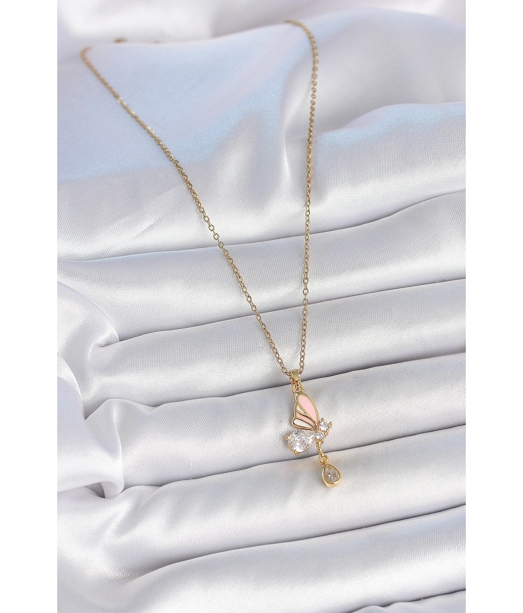 Shoecide 316l Çelik Gold Renk Zincir Damla Zirkon Taşlı Kelebek Model Sallantı Detay Kadın Kolye