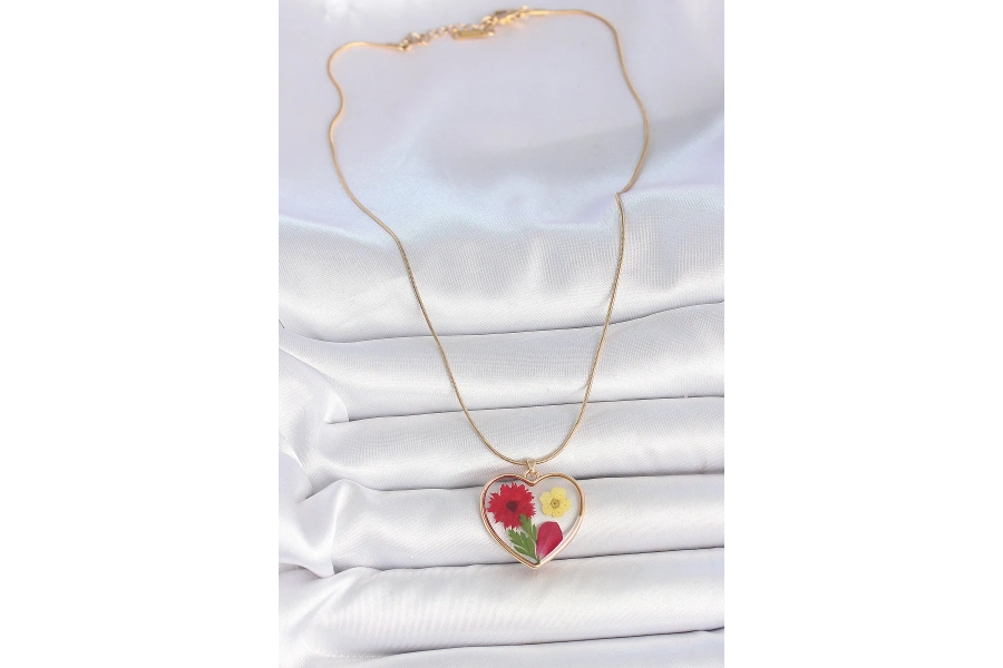 Shoecide 316l Çelik Gold Renk Zincir Epokis Kalp Doğal Çiçek Model Kadın Kolye