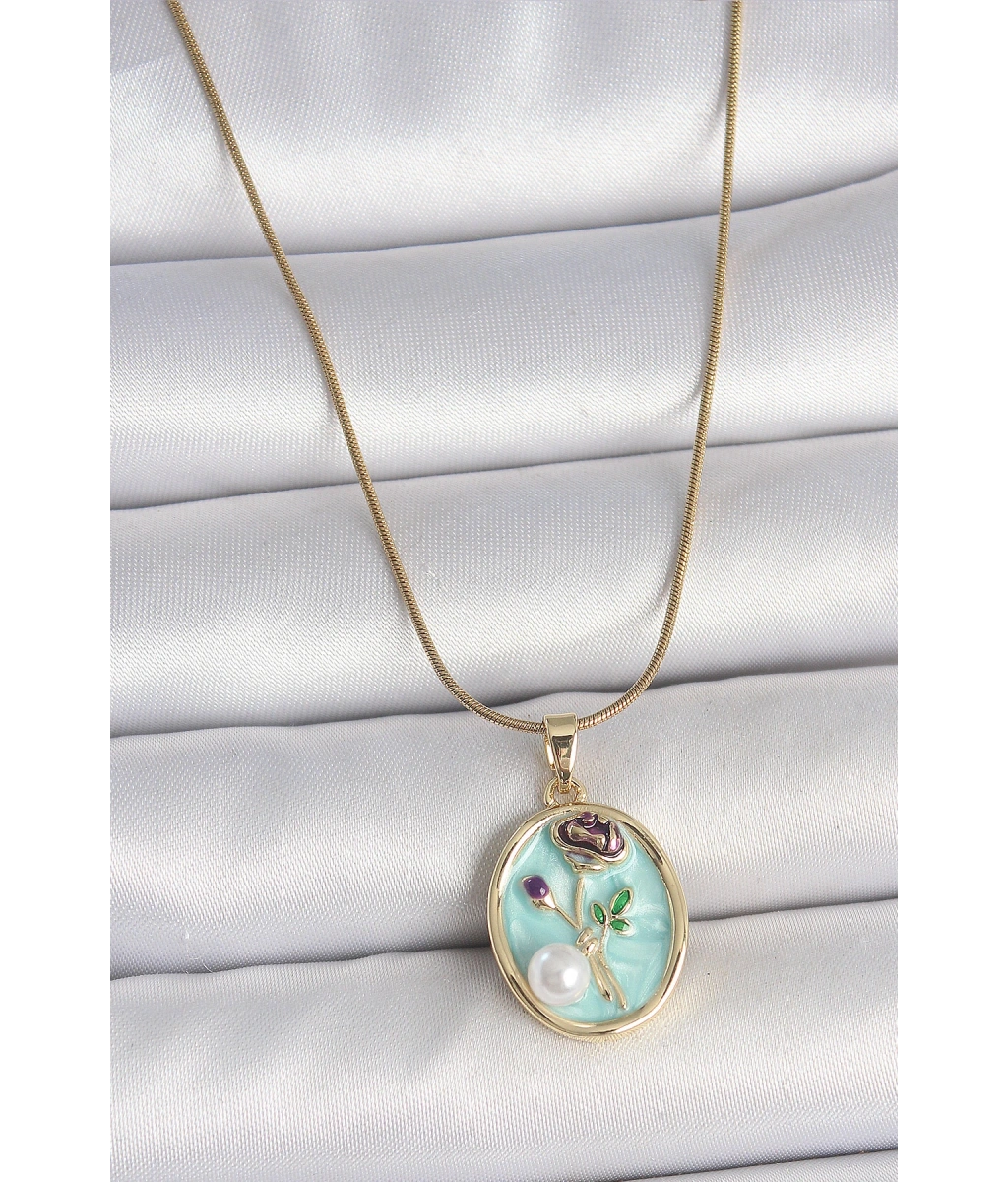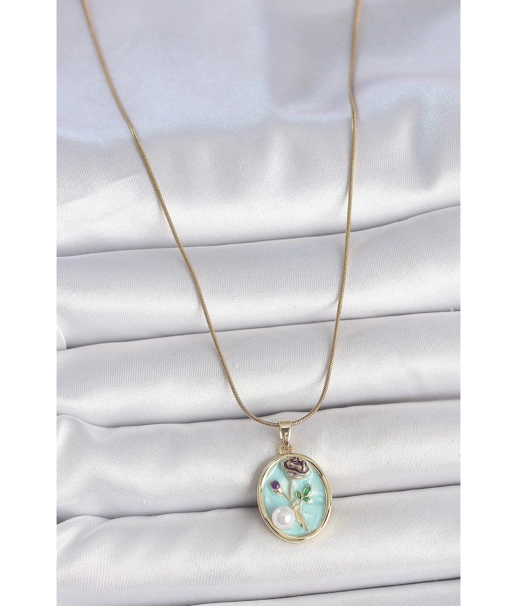 Shoecide 316l Çelik Gold Renk Zincir Mavi Çiçek İşlemeli İnci Detay Portre Model Kadın Kolye