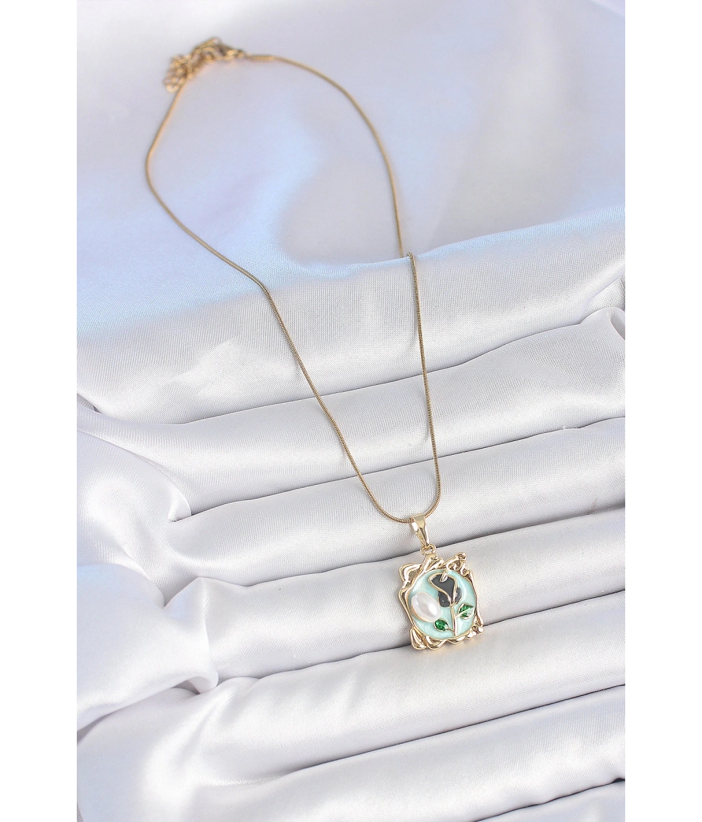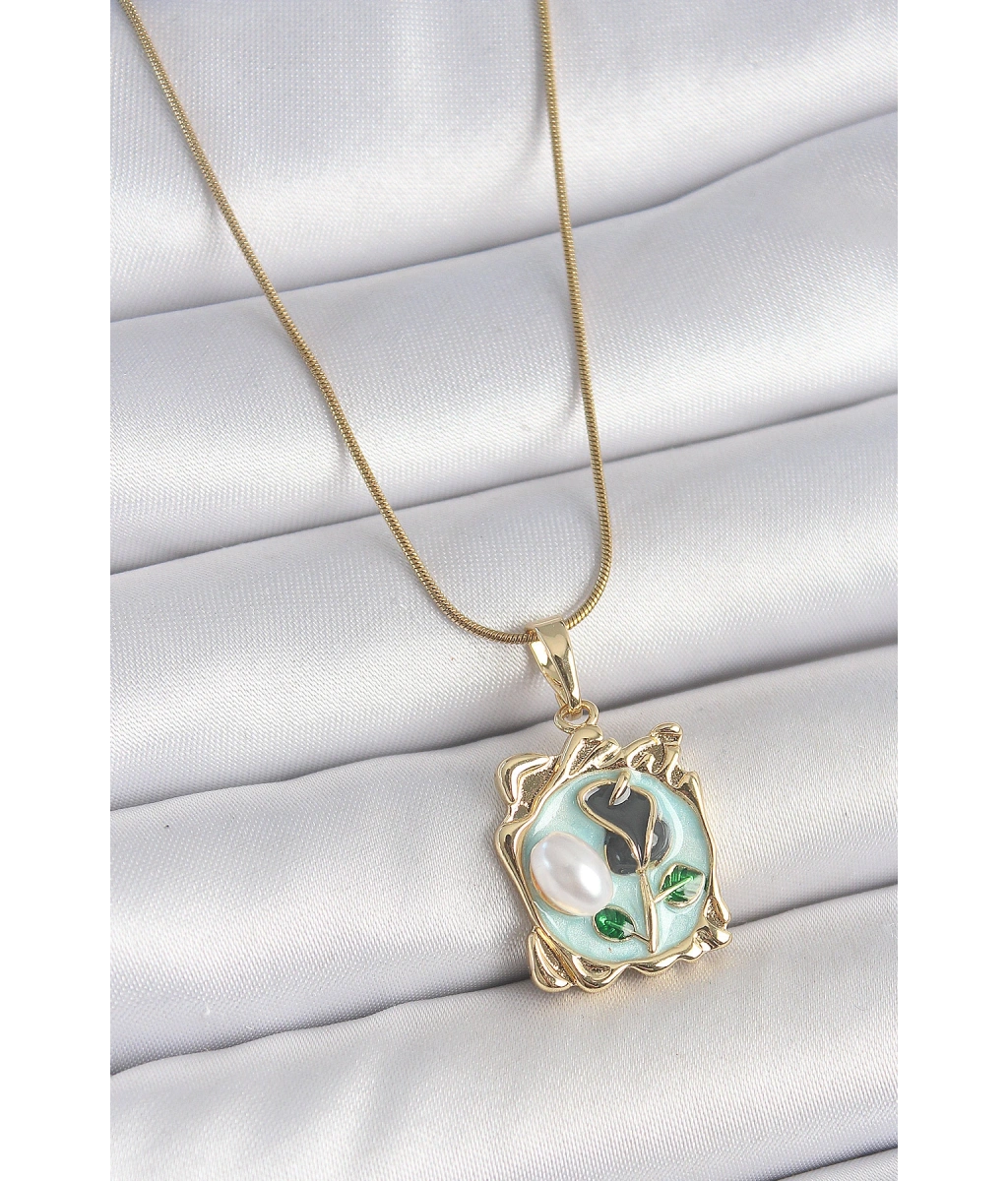 Shoecide 316l Çelik Gold Renk Zincir Mavi Mineli Çiçek İşlemeli İnci Detay Portre Model Kadın Kolye