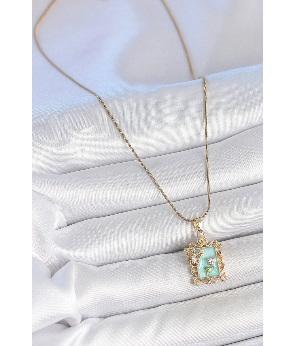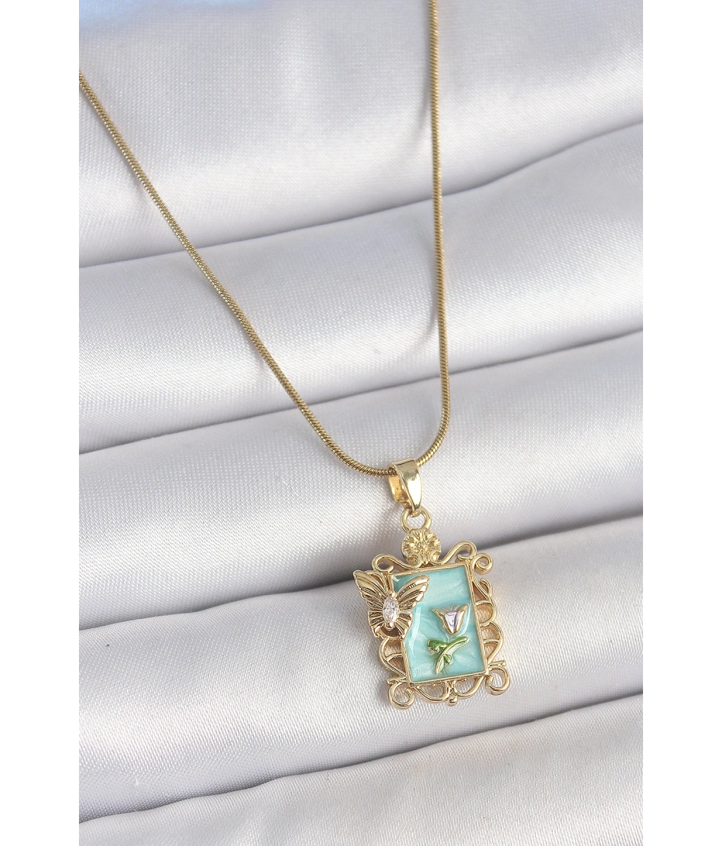 Shoecide 316l Çelik Gold Renk Zincir Mavi Mineli Çiçek İşlemeli Zirkon Taşlı Kelebek Detay Portre Model Kadın Kolye