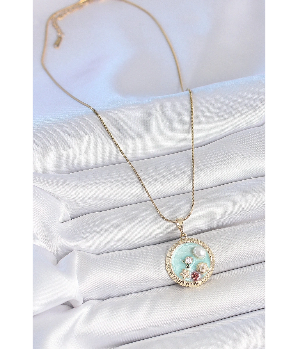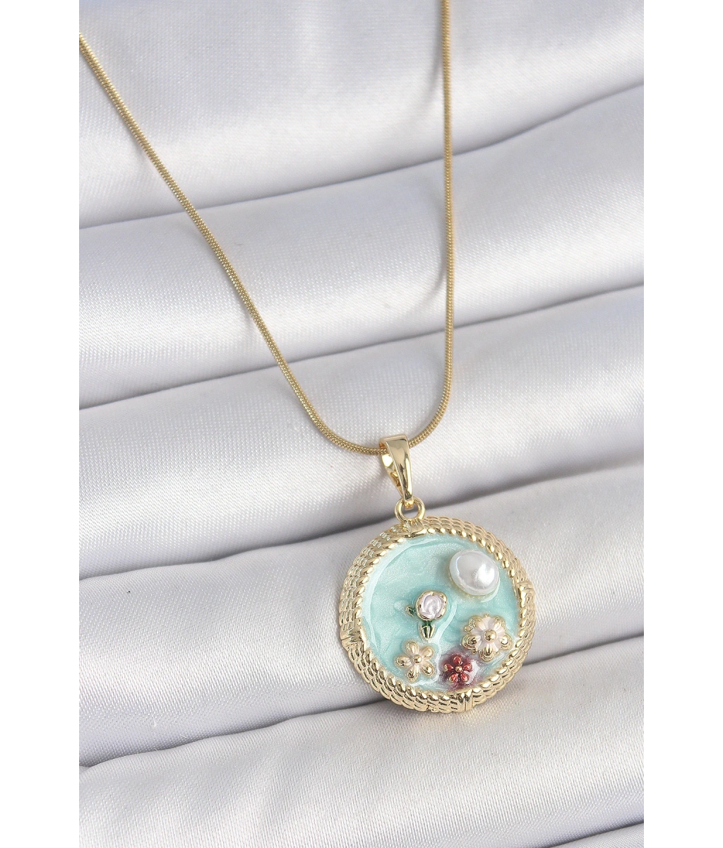 Shoecide 316l Çelik Gold Renk Zincir Mavi Mineli İnci Çiçek İşlemeli Zirkon Taş Detaylı Madalyon Model Kadın Kolye