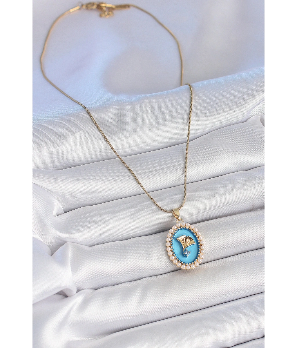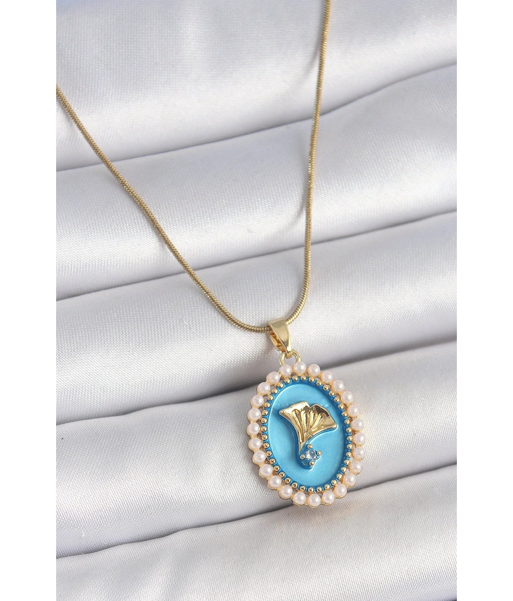 Shoecide 316l Çelik Gold Renk Zincir Mavi Mineli İncili Zirkon Taşlı Çiçek İşlemeli Portre Model Kadın Kolye