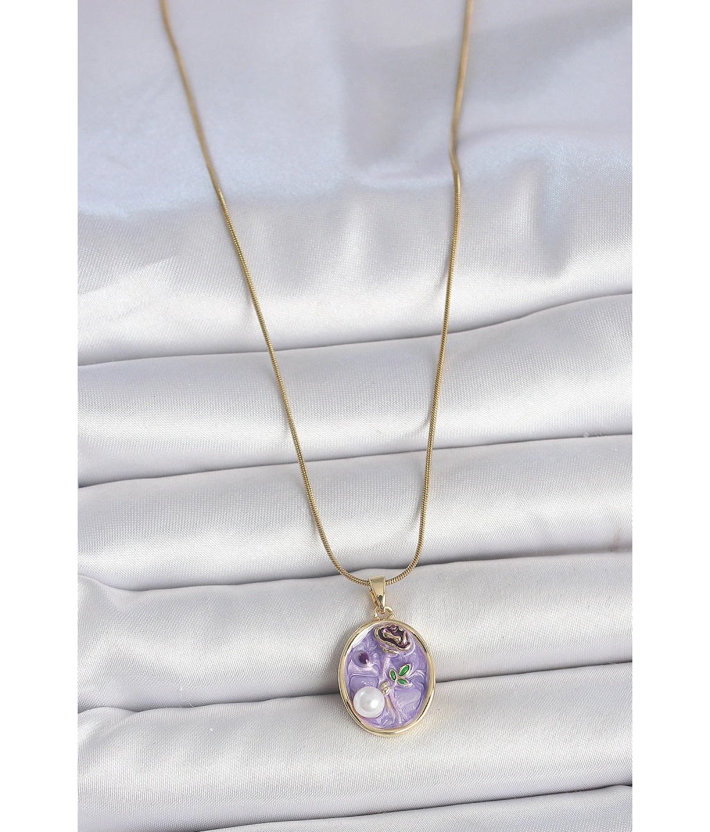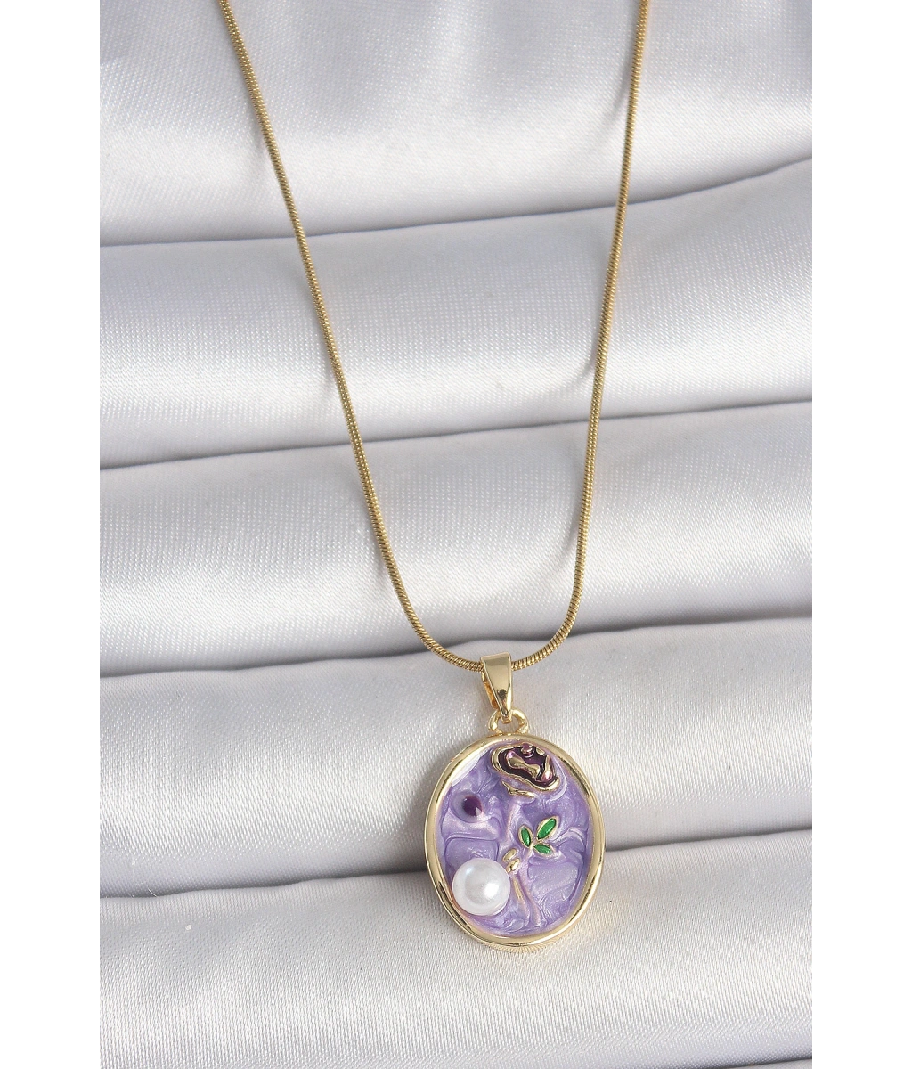 Shoecide 316l Çelik Gold Renk Zincir Mor Çiçek İşlemeli İnci Detay Portre Model Kadın Kolye