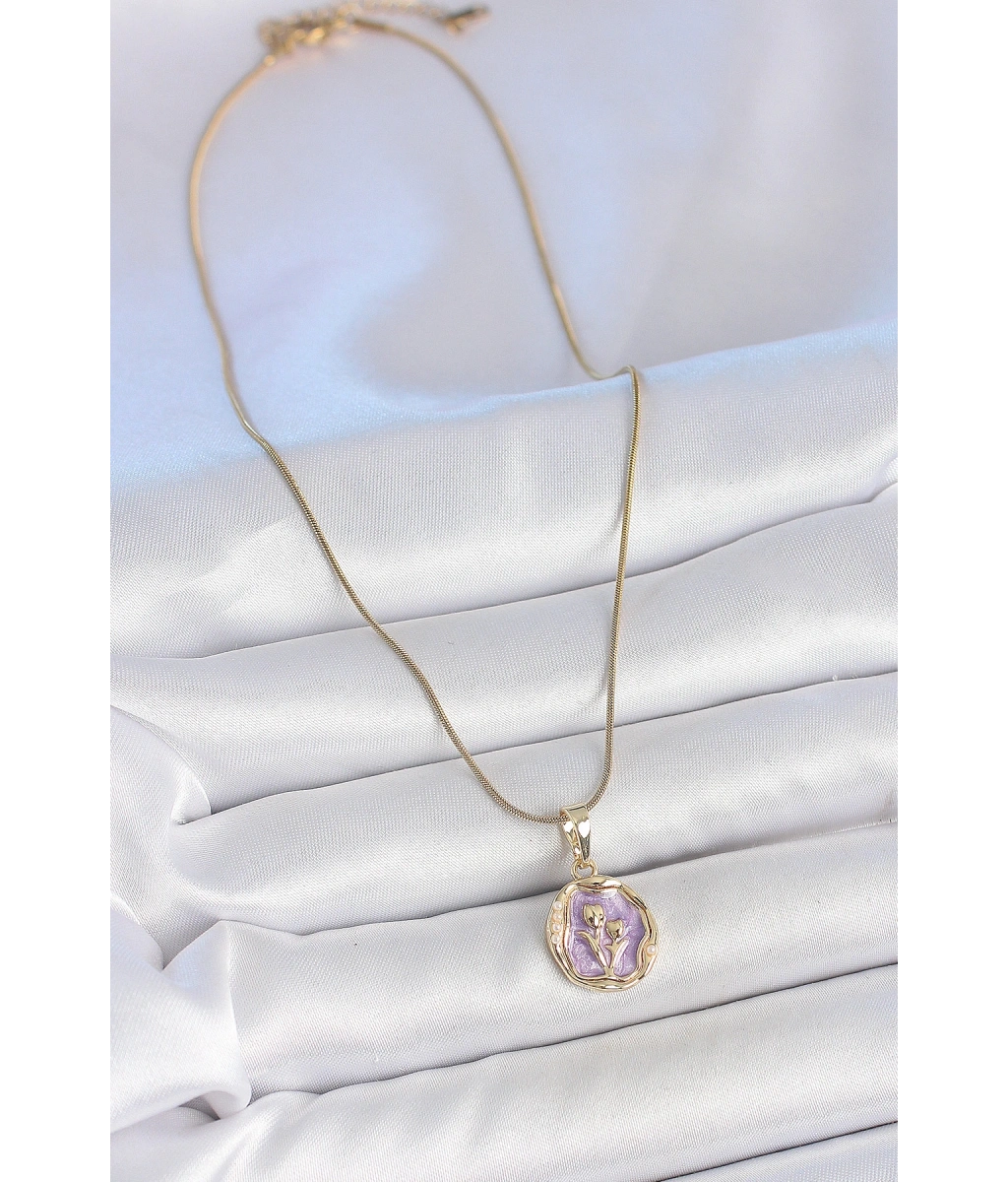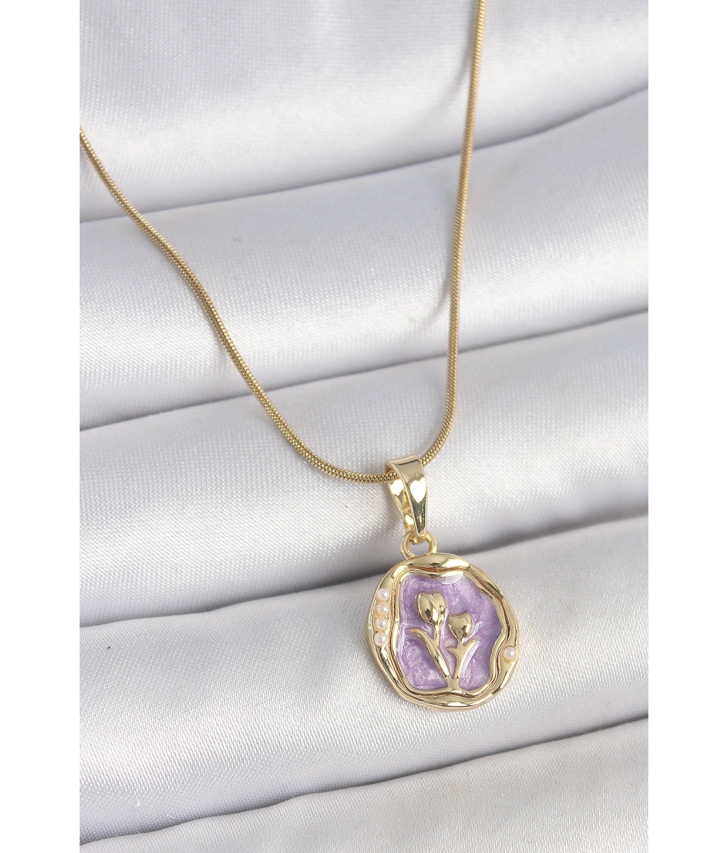Shoecide 316l Çelik Gold Renk Zincir Mor Mineli Çiçek İşlemeli Portre Model Kadın Kolye