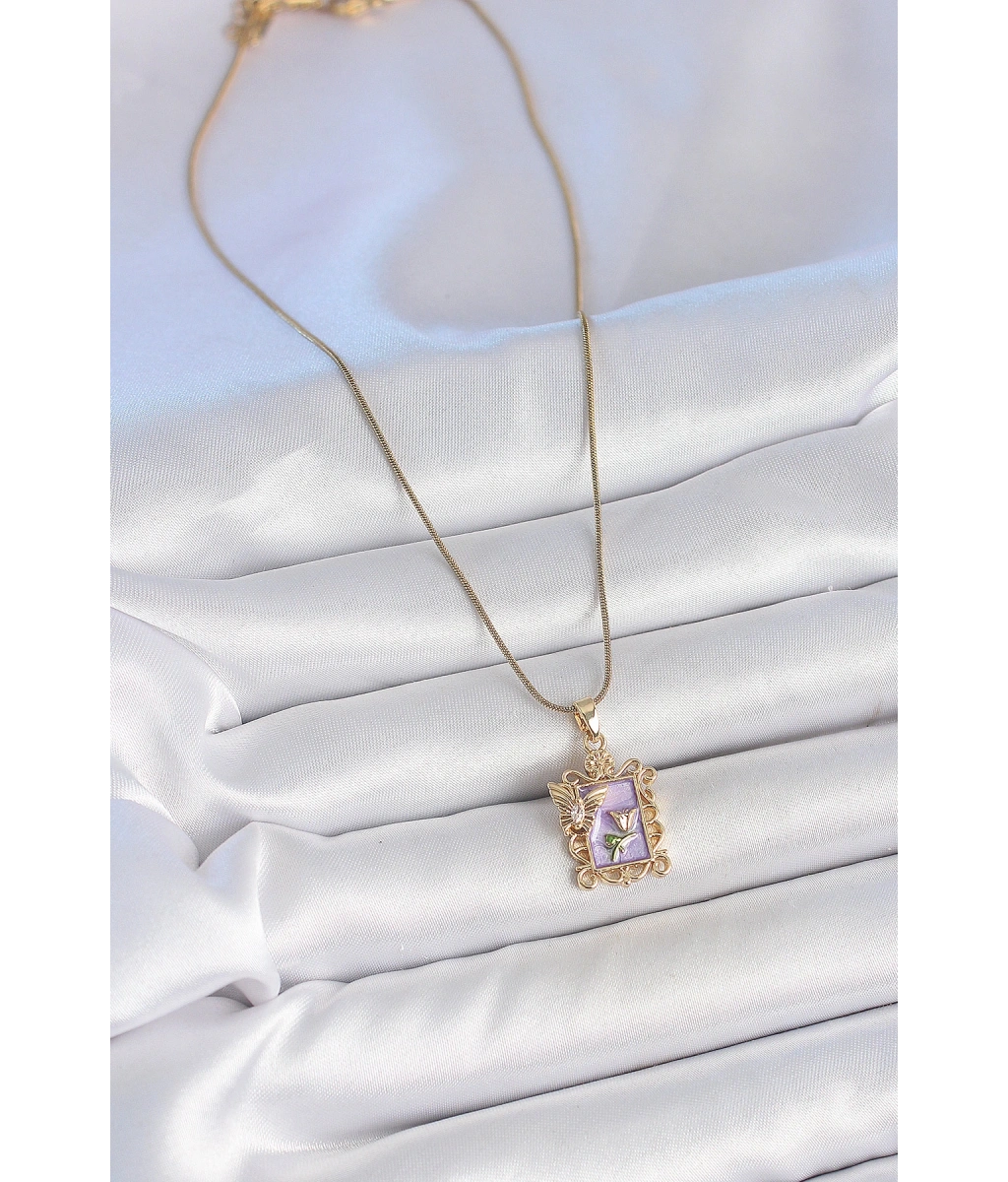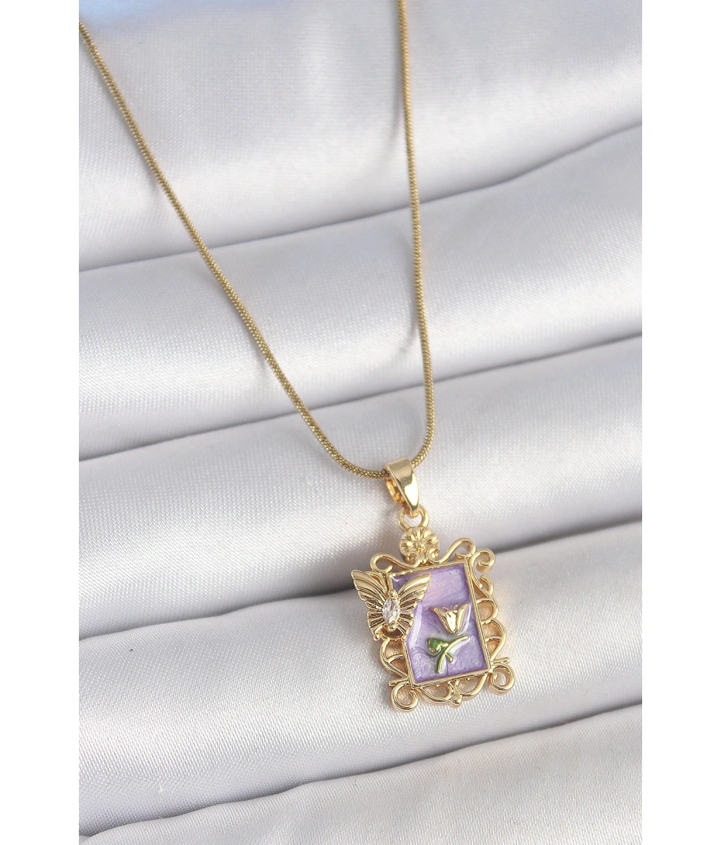 Shoecide 316l Çelik Gold Renk Zincir Mor Mineli Çiçek İşlemeli Zirkon Taşlı Kelebek Detay Portre Model Kadın Kolye