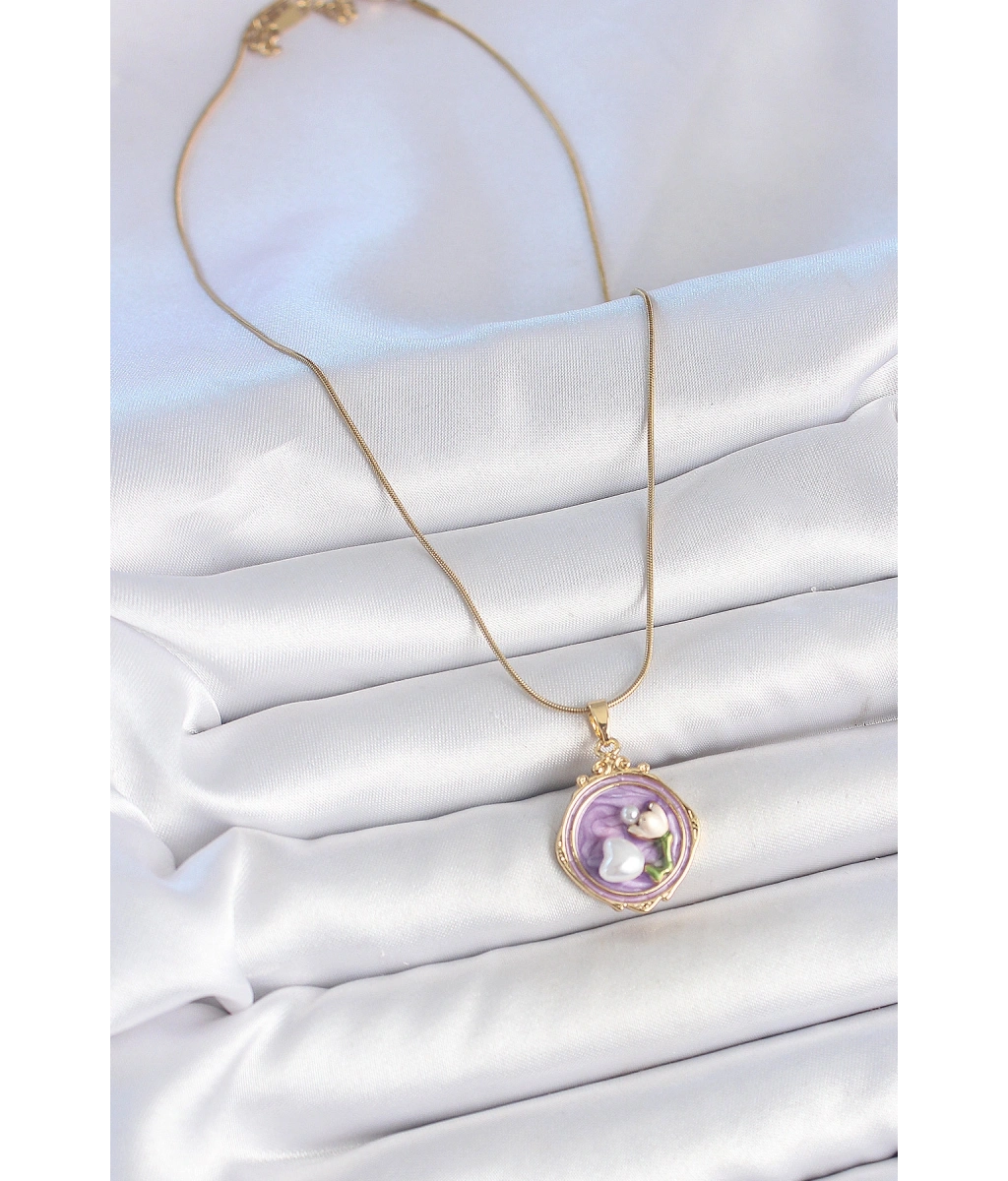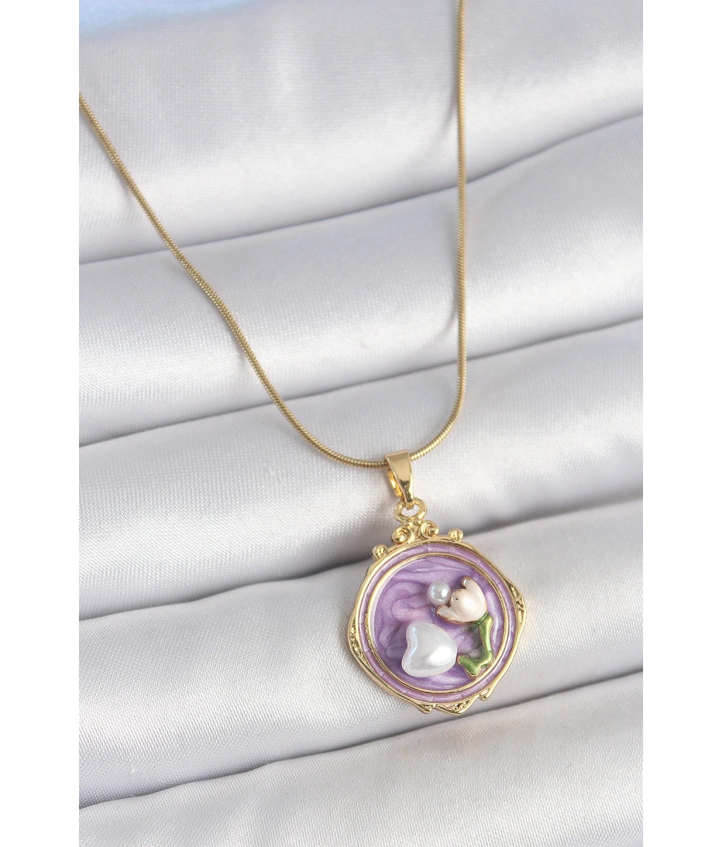 Shoecide 316l Çelik Gold Renk Zincir Mor Mineli İncili Çiçek İşlemeli Portre Model Kadın Kolye