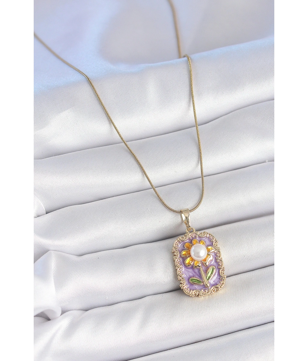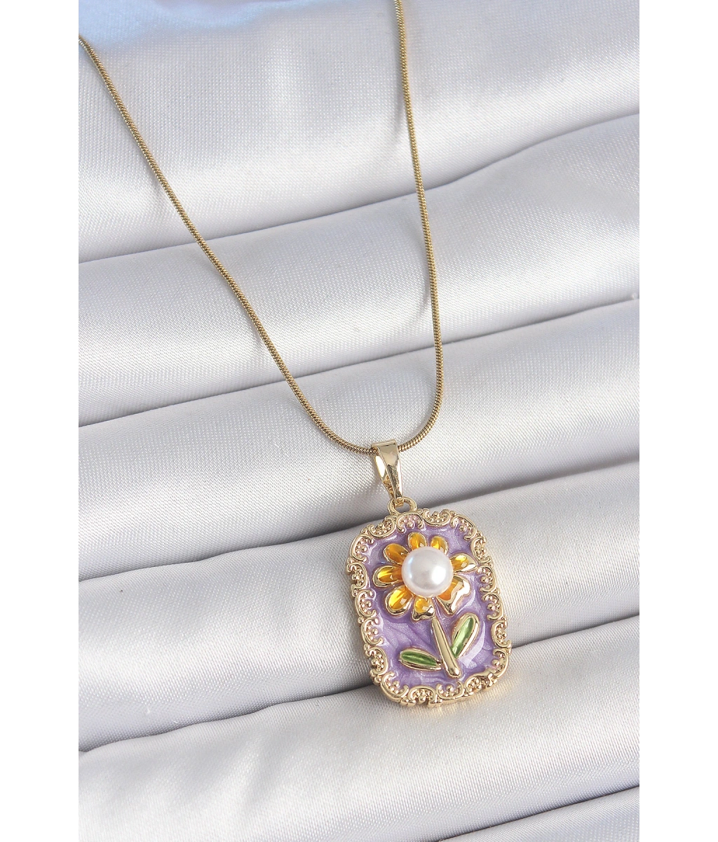 Shoecide 316l Çelik Gold Renk Zincir Mor Mineli İncili Papatya İşlemeli Portre Model Kadın Kolye