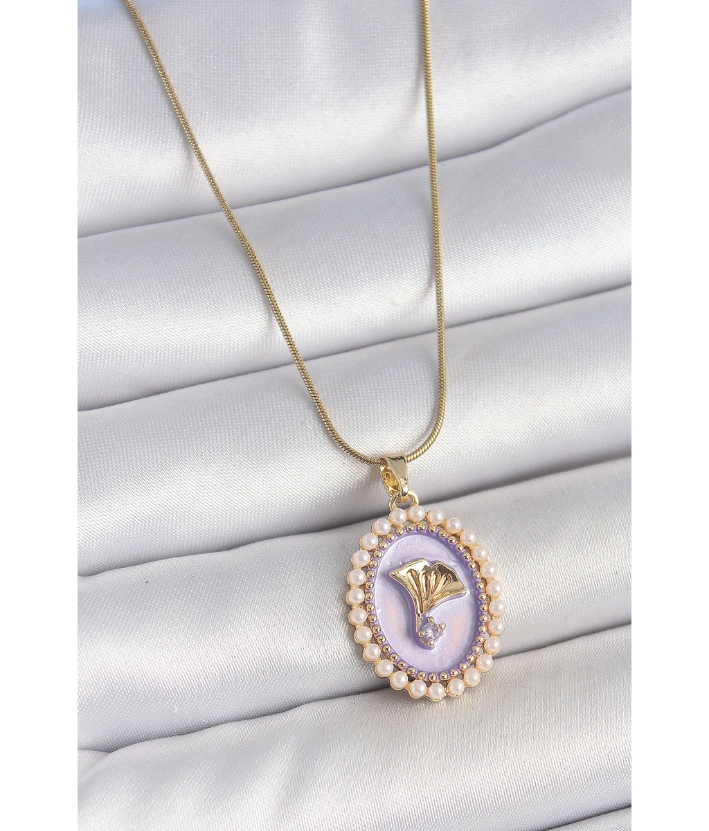 Shoecide 316l Çelik Gold Renk Zincir Mor Mineli İncili Zirkon Taşlı Çiçek İşlemeli Portre Model Kadın Kolye