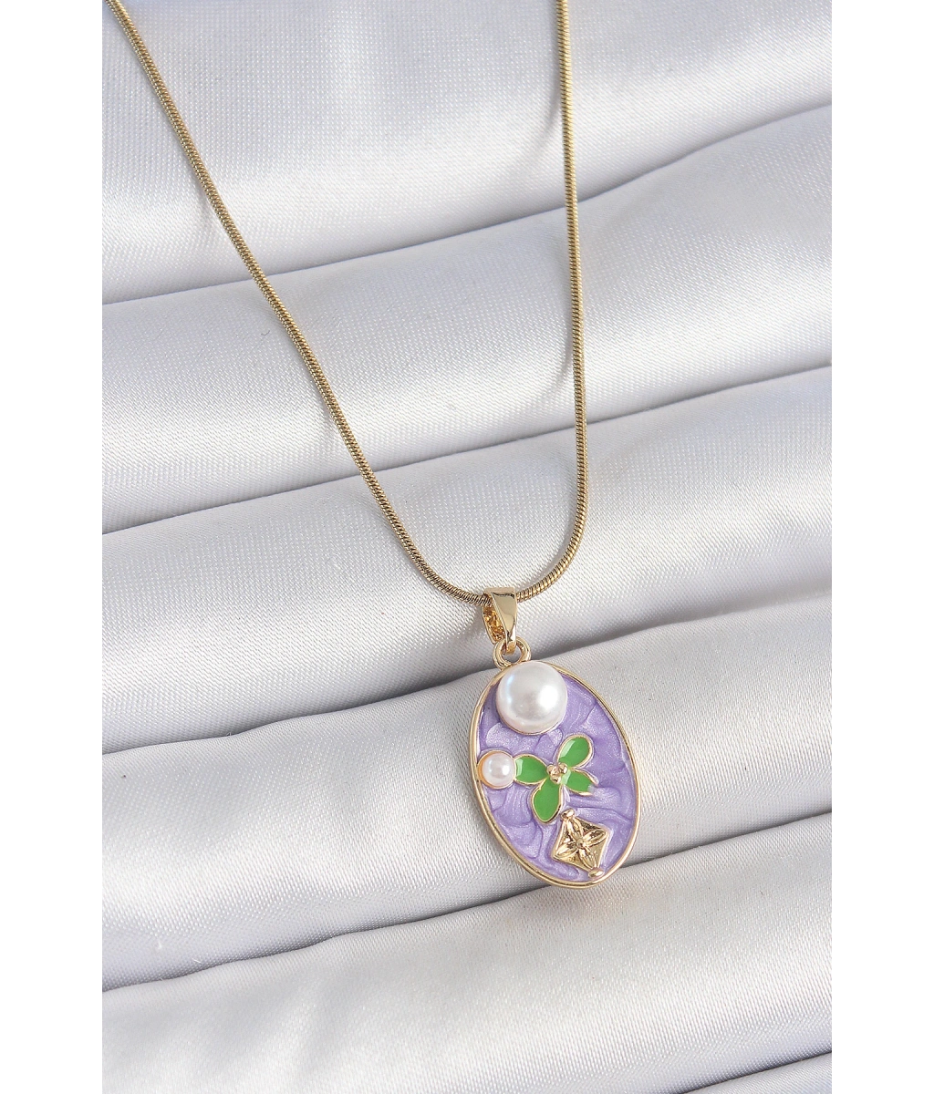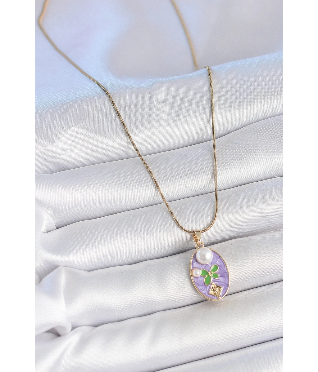 Shoecide 316l Çelik Gold Renk Zincir Mor Mineli Oval İncili Çiçek İşlemeli Portre Model Kadın Kolye