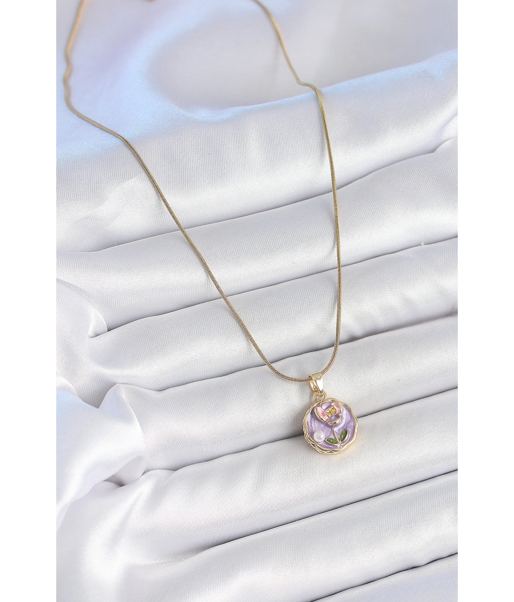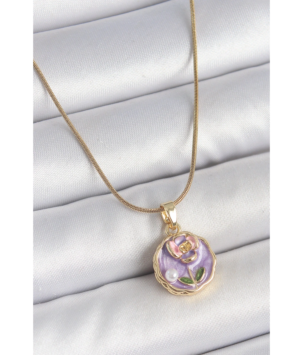 Shoecide 316l Çelik Gold Renk Zincir Mor Minimal Çiçek İşlemeli İnci Detay Portre Model Kadın Kolye
