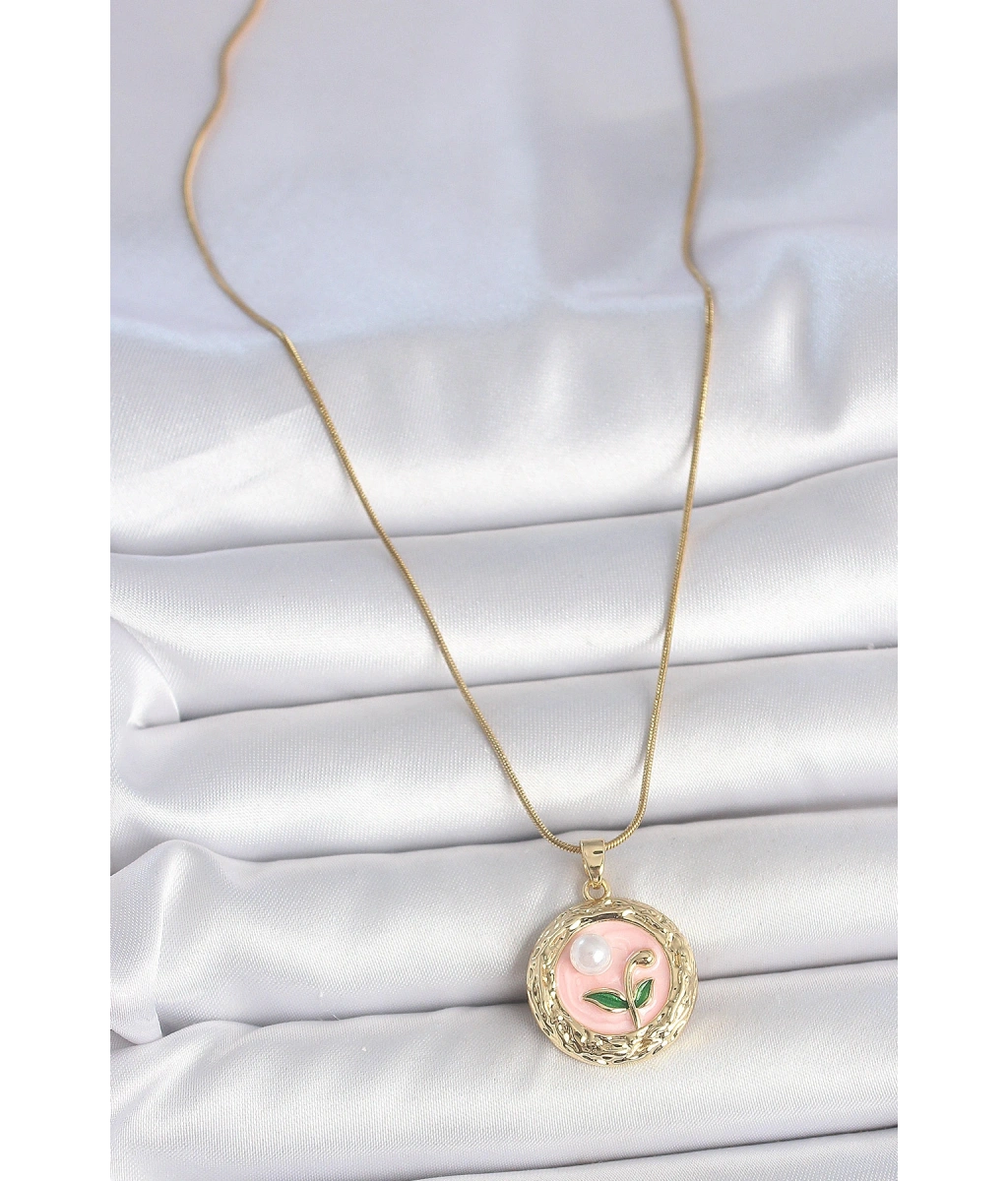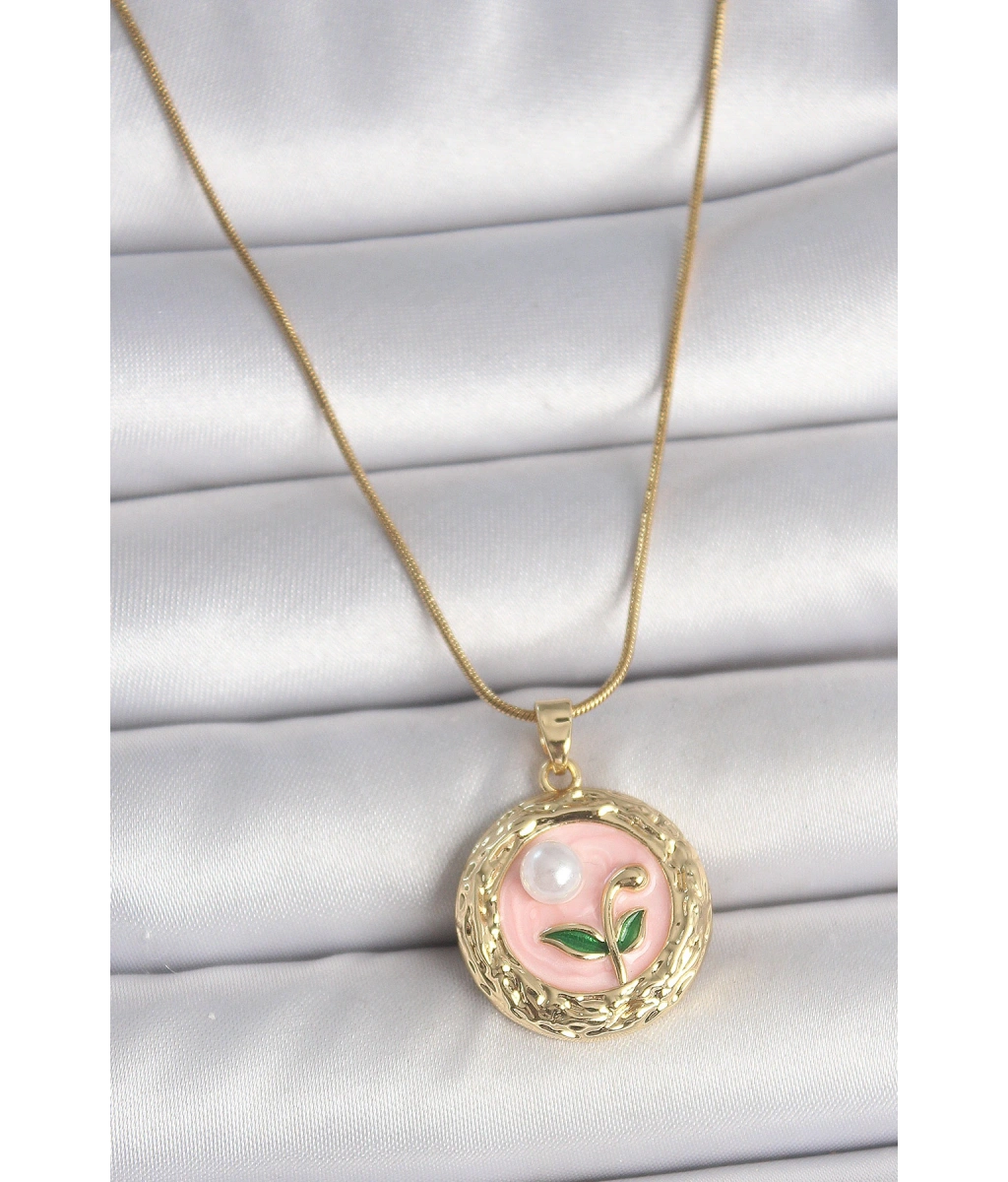 Shoecide 316l Çelik Gold Renk Zincir Pembe Çiçek İşlemeli İnci Detay Portre Model Kadın Kolye