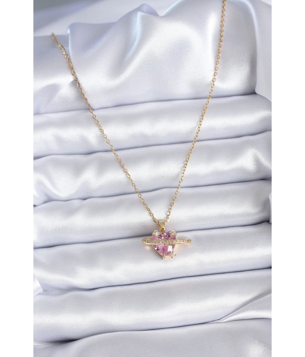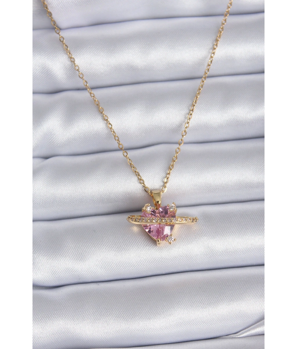 Shoecide 316l Çelik Gold Renk Zincir Pembe Kristal Kalp Model Zirkon Taş Detay Kadın Kolye