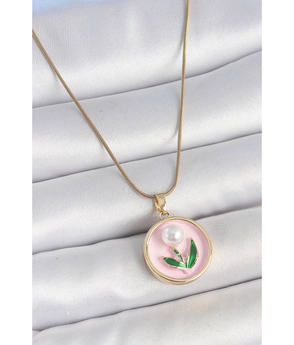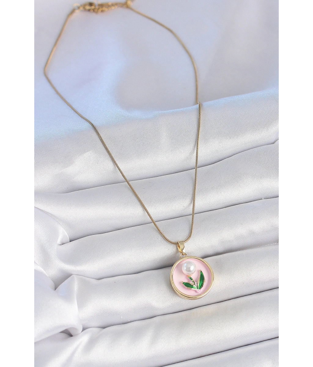 Shoecide 316l Çelik Gold Renk Zincir Pembe Mineli İncili Çiçek İşlemeli Portre Model Kadın Kolye