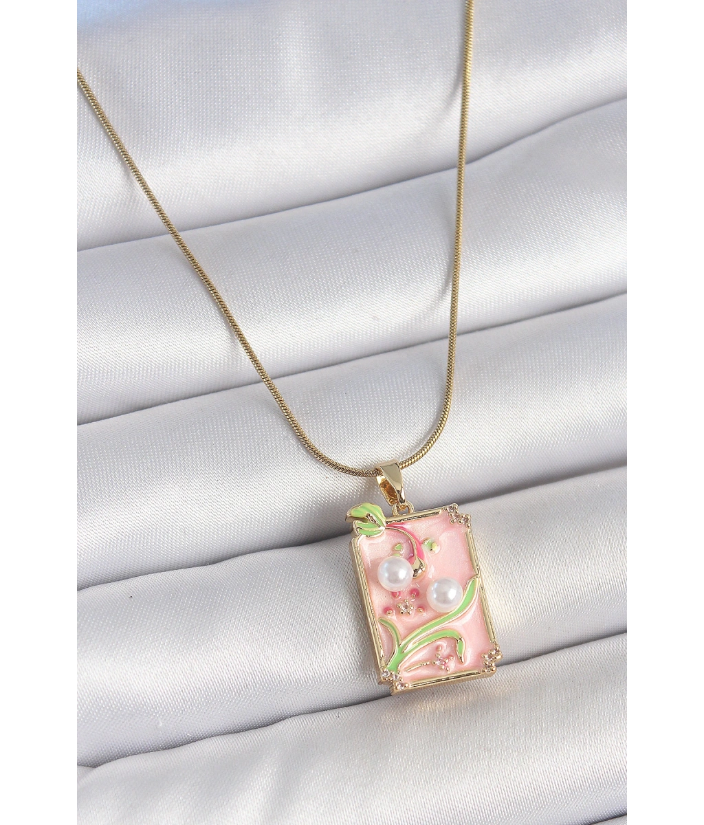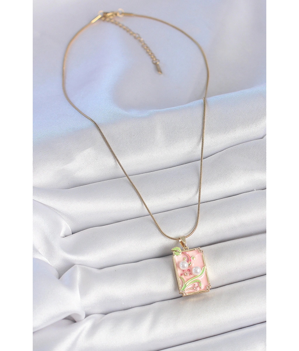 Shoecide 316l Çelik Gold Renk Zincir Pembe Mineli İncli Çiçek İşlemeli Portre Model Kadın Kolye