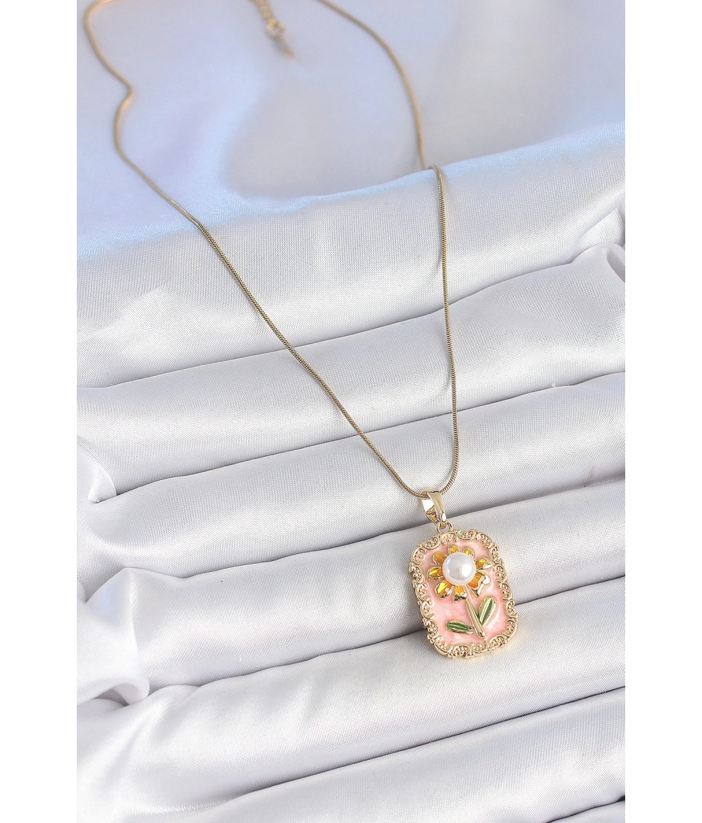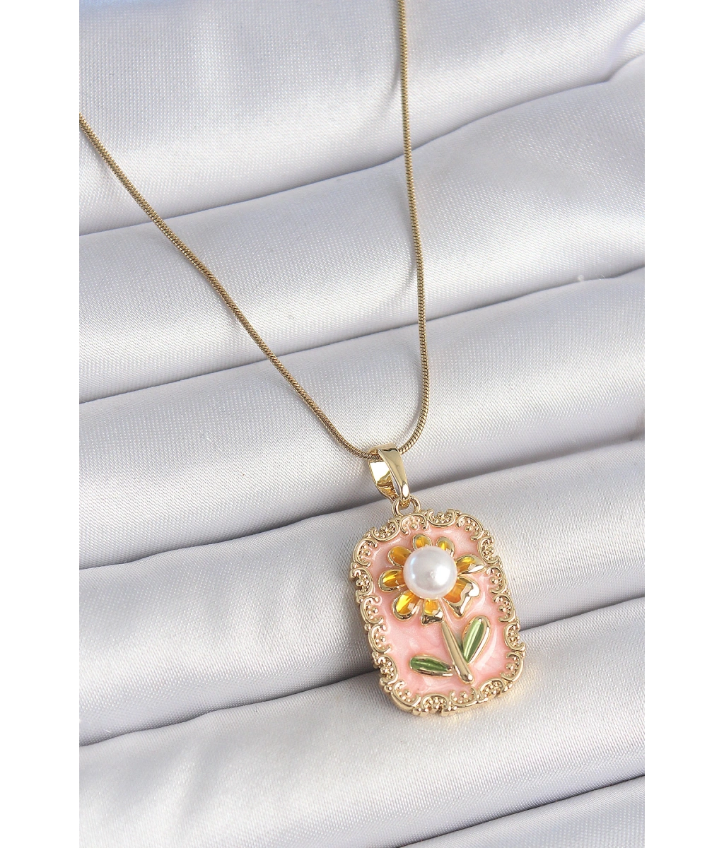 Shoecide 316l Çelik Gold Renk Zincir Pembe Mineli İncli Papatya Model Portre Model Kadın Kolye