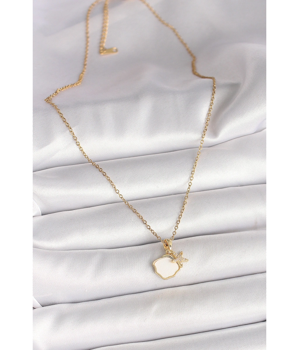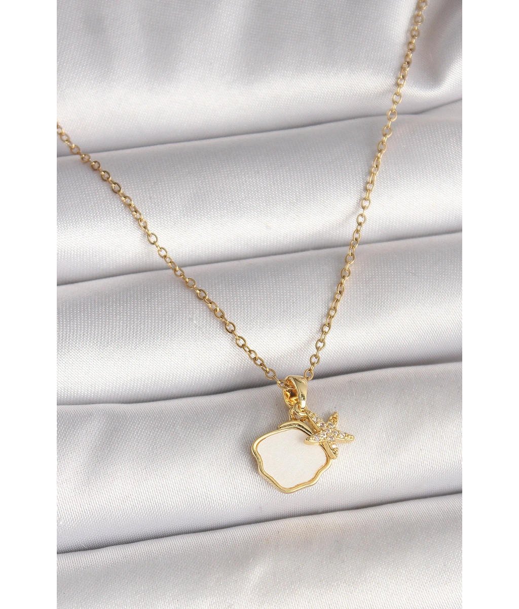 Shoecide 316l Çelik Gold Renk Zincir Sallantı Beyaz Mineli Deniz Kabuğu Zirkon Taşlı Deniz Yıldızı Figür Kadın Kolye