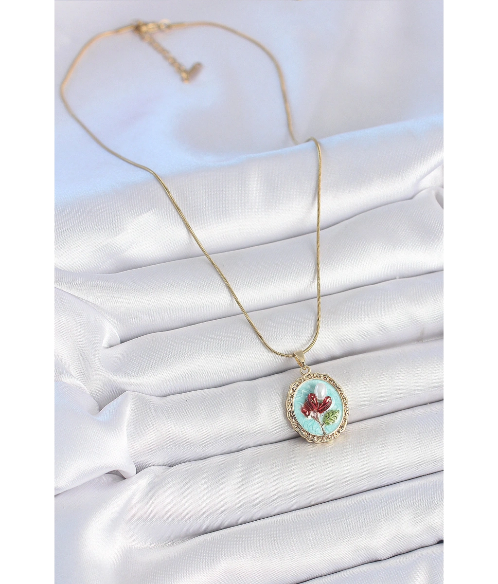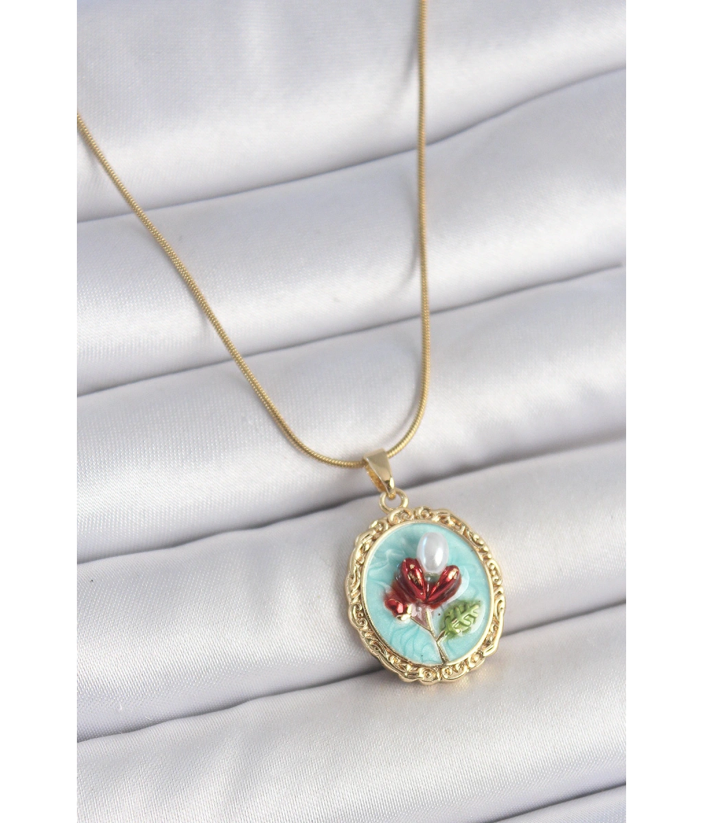 Shoecide 316l Çelik Gold Renk Zincir Turkuaz Mineli İncili Çiçek İşlemeli Portre Model Kadın Kolye