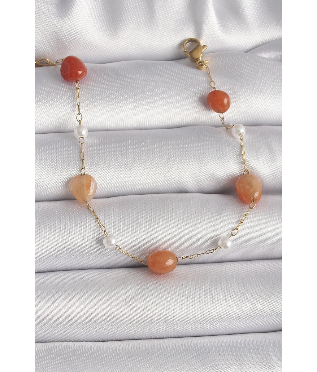 Shoecide 316l Çelik Gold Renk Zincir Turuncu Doğaltaş Model İnci Detay Kadın Bileklik