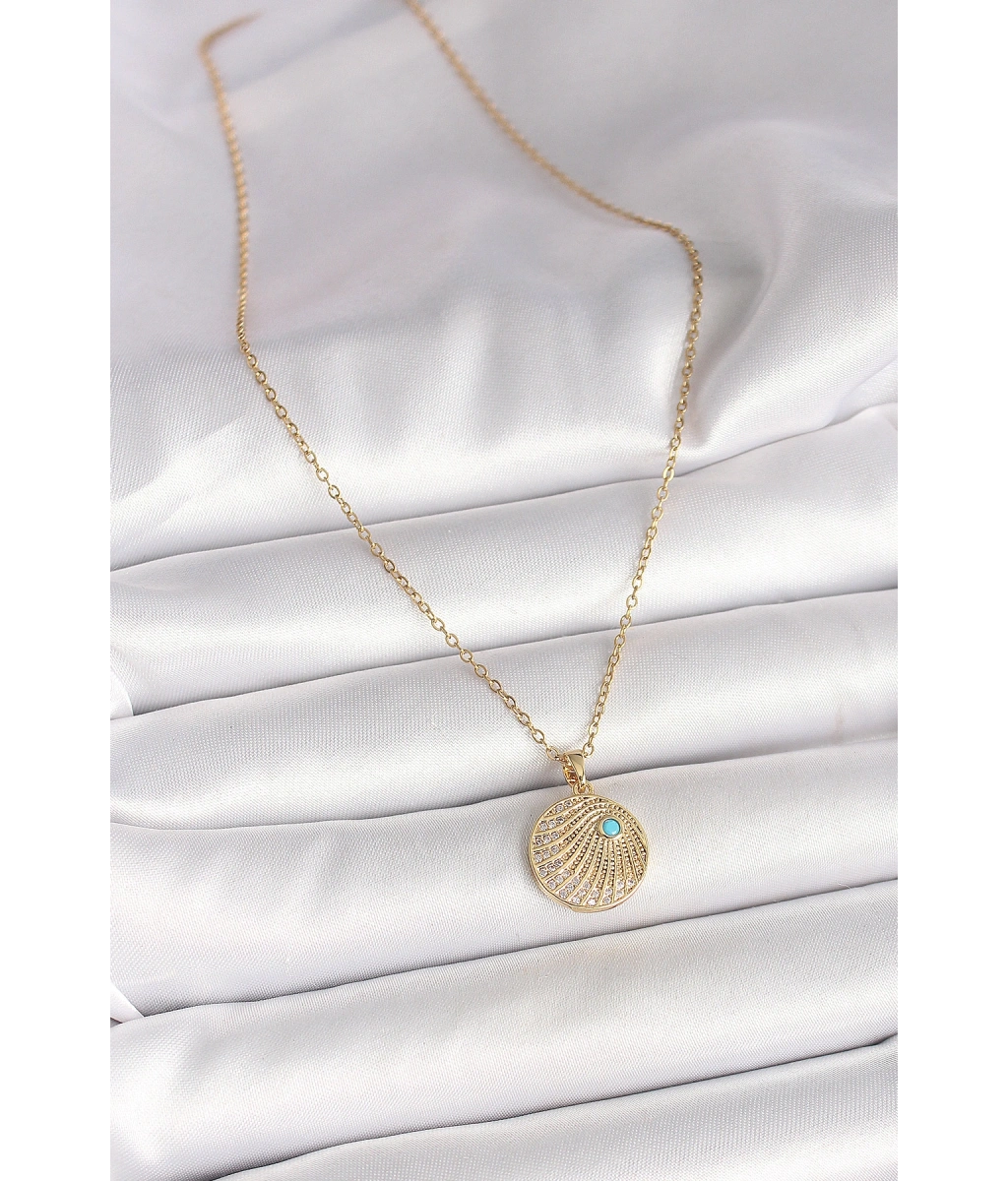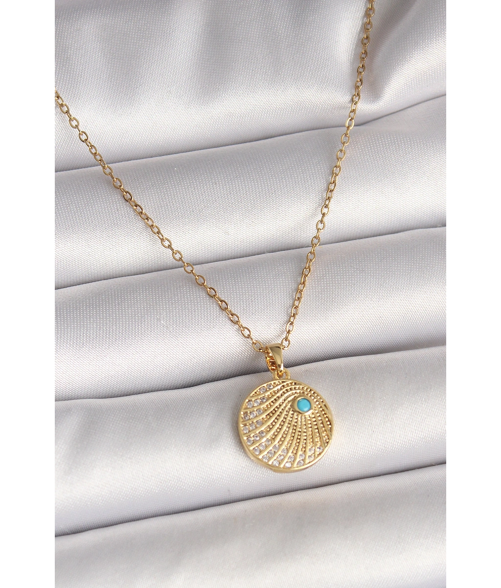 Shoecide 316l Çelik Gold Renk Zincir Zirkon Taş İşlemeli Mavi Taş Detaylı Madalyon Model Kadın Kolye