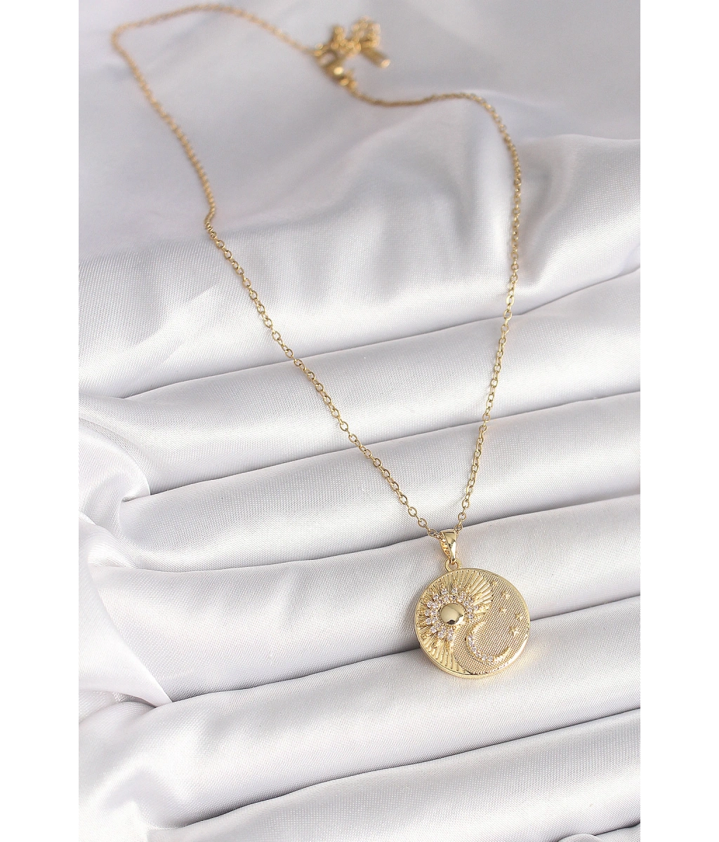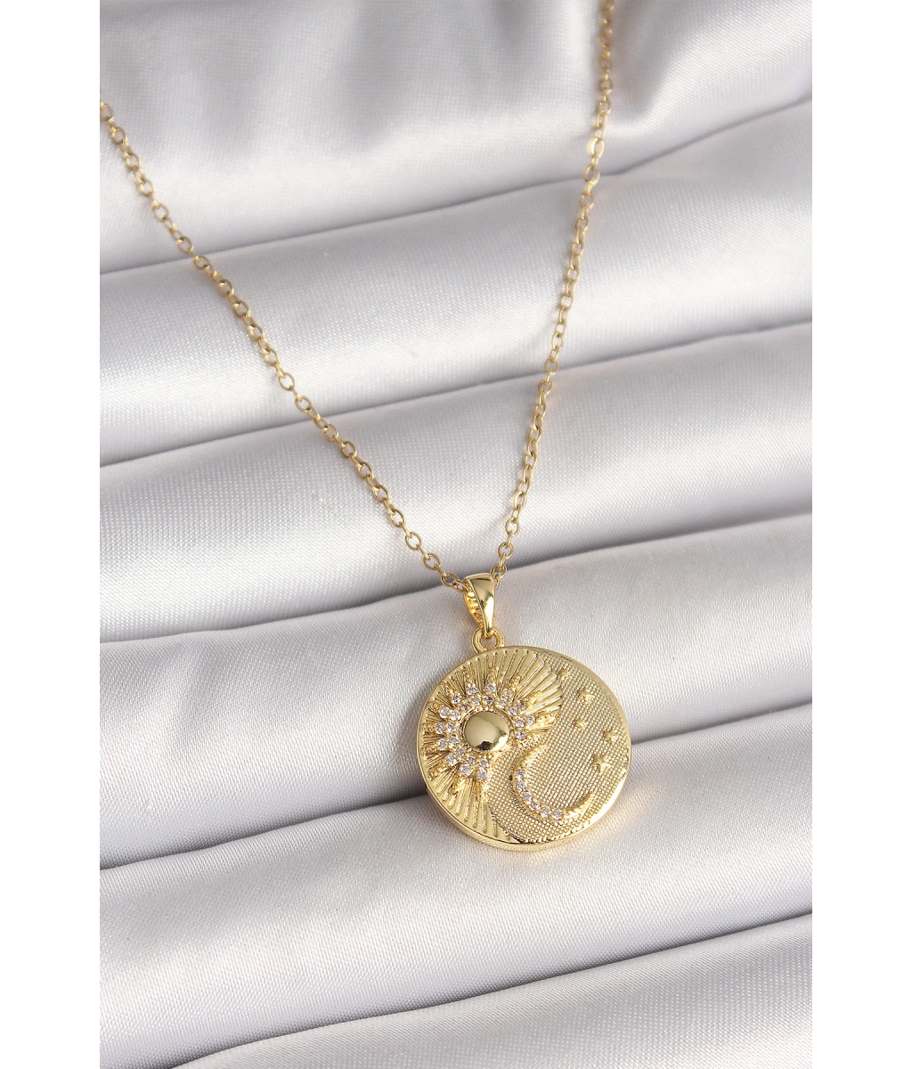 Shoecide 316l Çelik Gold Renk Zincir Zirkon Taşlı Ay Güneş İşlemeli Madalyon Model Kadın Kolye
