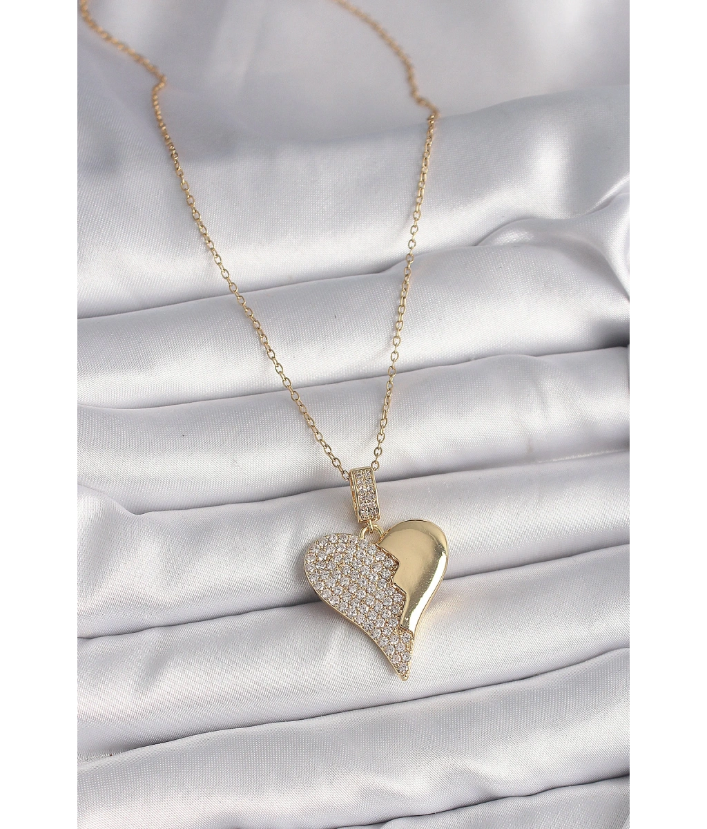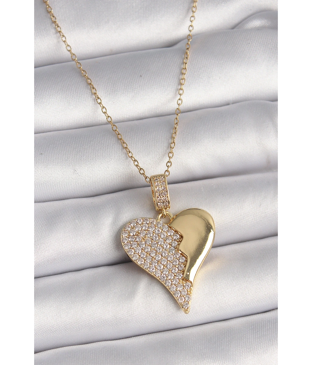 Shoecide 316l Çelik Gold Renk Zincir Zirkon Taşlı Kırık Kalp Model Kadın Kolye