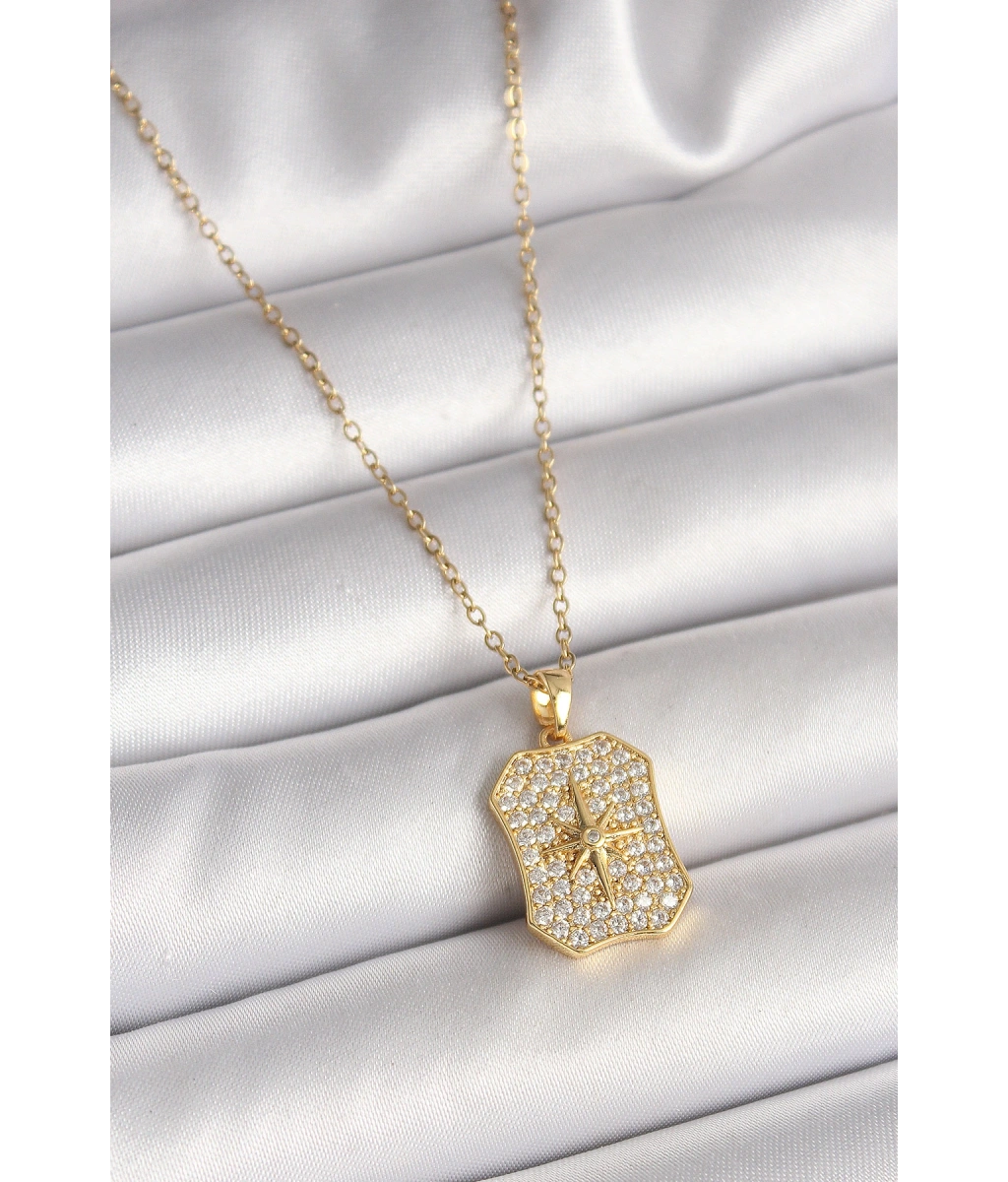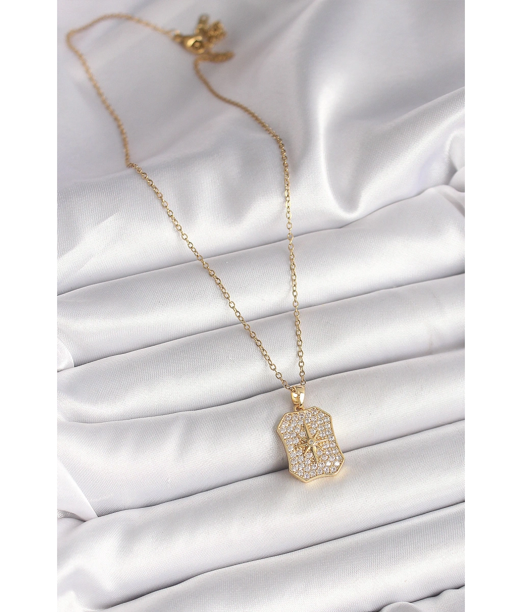 Shoecide 316l Çelik Gold Renk Zincir Zirkon Taşlı Kutup Yıldız İşlemeli Madalyon Model Kadın Kolye
