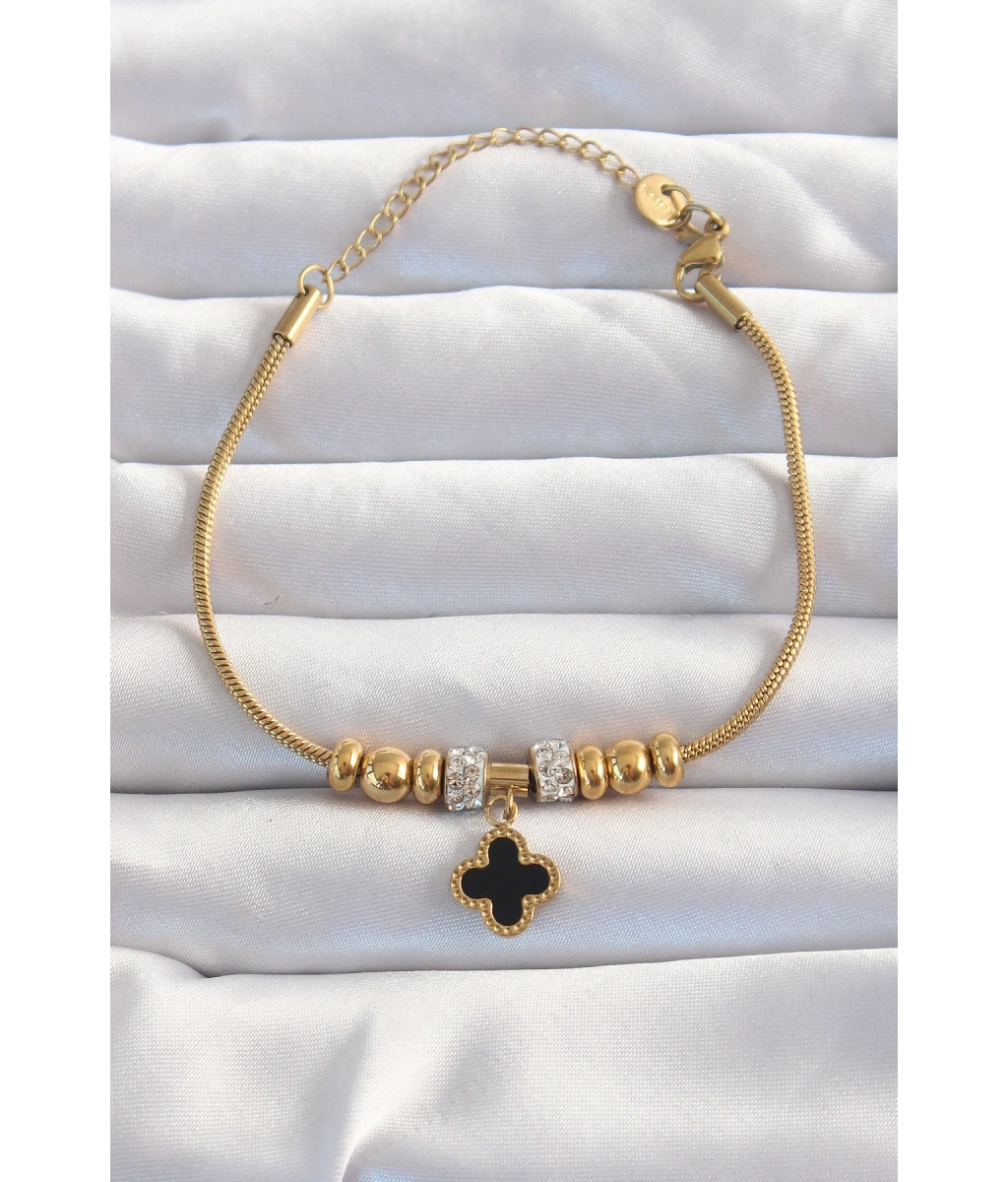Shoecide 316l Çelik Gold Renk Zirkon Taş Aksesuarlı Siyah Mineli Yonca Bileklik