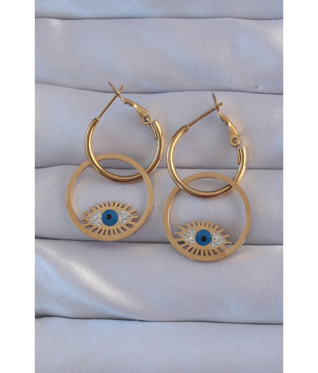 Shoecide 316l Çelik Gold Renk Zirkon Taşlı Mavi Göz Tasarımlı Halka Küpe